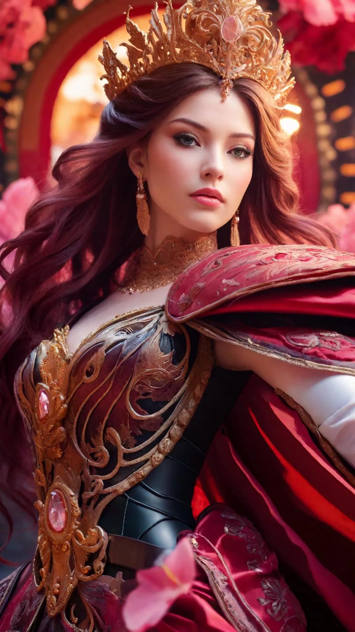 Vivid AI-generated art of a majestic woman with radiant red hair, glowing eyes, and a golden crown against a vibrant pink backdrop. Her ornate gold-accented dress and contrasting black sleeve create striking elegance. Explore AI-powered creativity to transform text into stunning visuals with rich details, bold contrasts, and professional editing tools for captivating, luminous imagery.