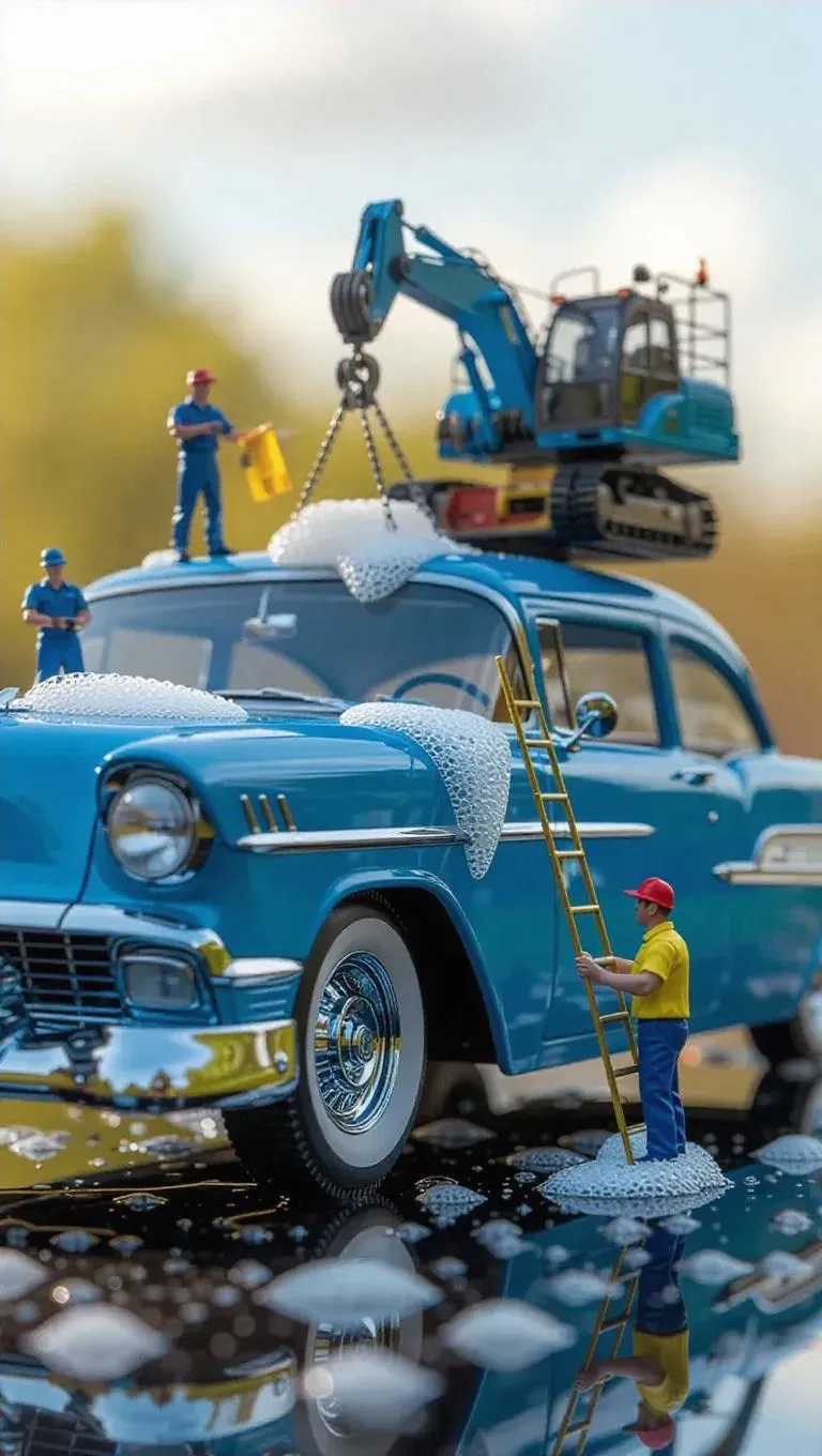 Generate a hyper-realistic 8K scene of microscopic car washers cleaning a colossal blue vehicle with thimble-sized hoses and bottle-cap buckets. Features ultra-detailed textures, cinematic depth of field, and hyper-realistic reflections. Perfect AI-generated imagery showcasing professional-grade editing tools for surreal scale contrasts and photorealistic visual storytelling. Elevate creative projects with Vivago.ai's advanced AI effects.