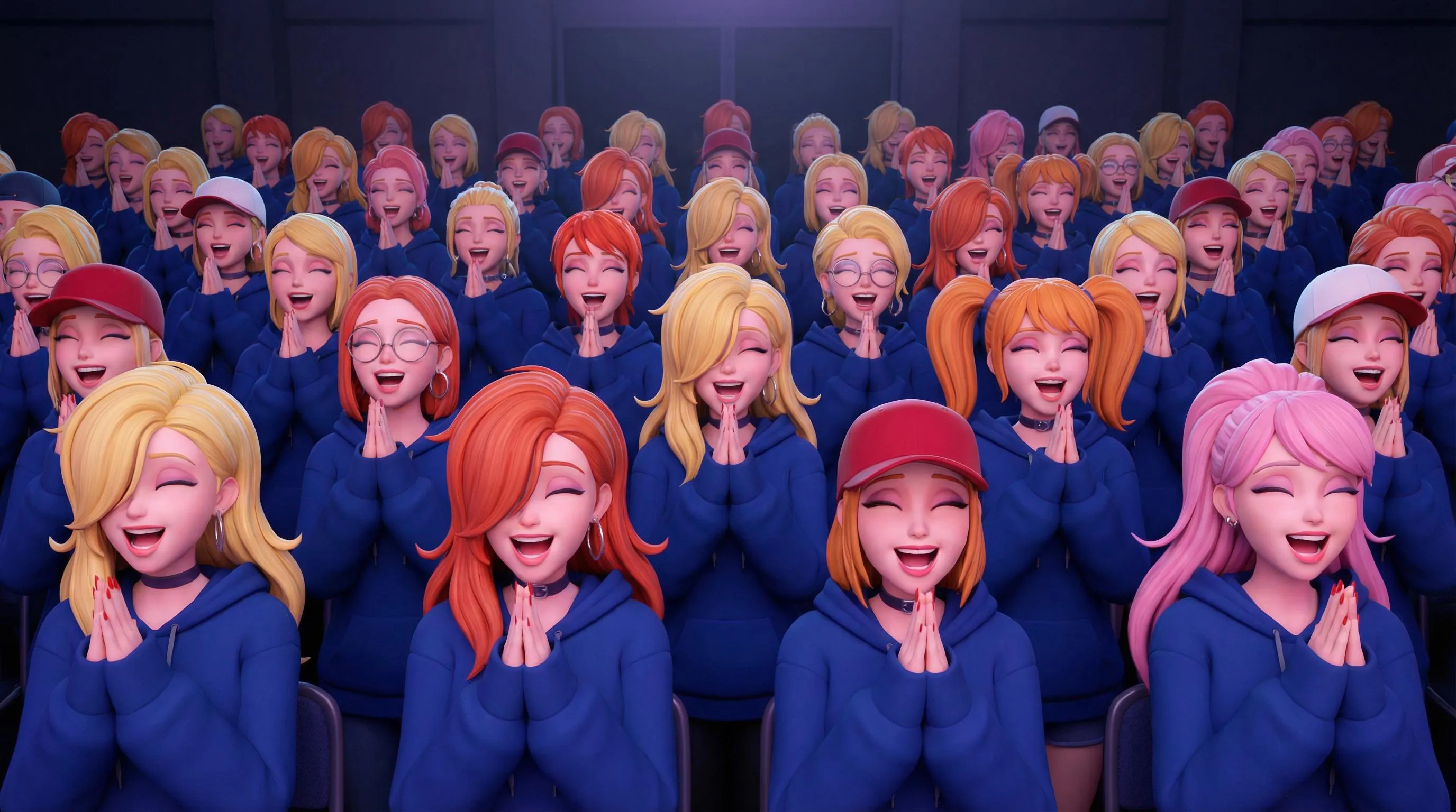 Create anime-inspired CGI crowds with Final Fantasy hairstyles in deep blue hoodies featuring moe sleeves hiding praying hands. Vibrant accessories like baseball hats, chokers, and colored nails. Generate diverse characters with elated expressions, side-swept hair, and unique sleeve styles using this AI image generator for vivid fan art scenes.