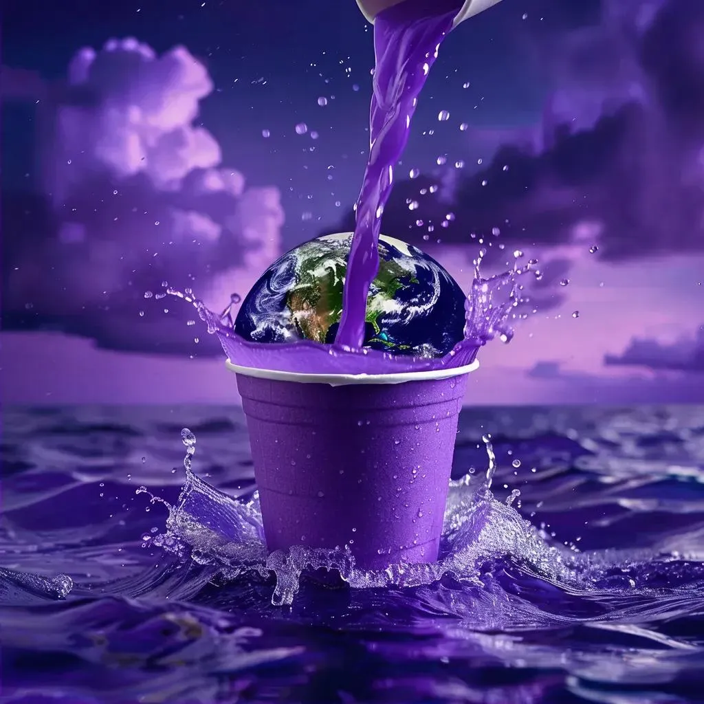 Generate AI visuals of a surreal planet with purple oceans and a styrofoam cup pouring liquid into the sea. Explore creative AI image generation with vivago.ai's tools, blending sci-fi elements and dreamlike landscapes. Transform text prompts into striking, professional-grade art effortlessly.