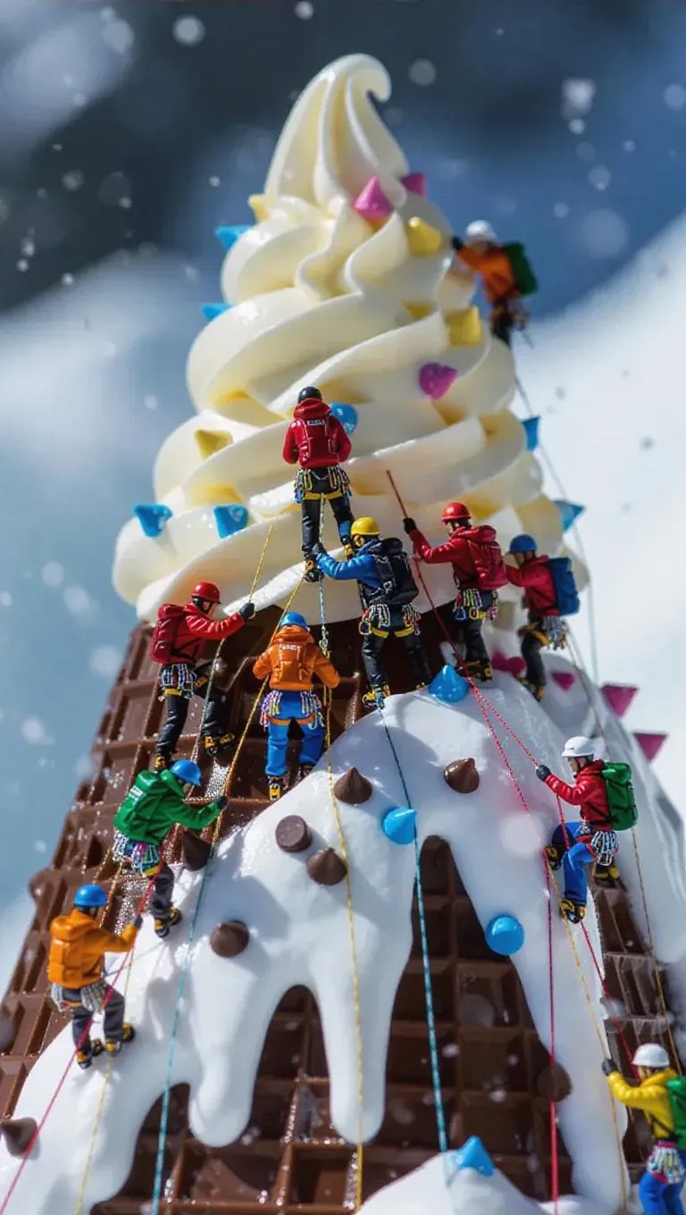 Tiny climbers scale a colossal ice cream mountain with ropes, pickaxes, and chocolate chip base camps. Melting ice cream avalanches cascade as AI transforms this surreal winter adventure into vivid visuals. Perfect for AI image generation, blending frosty expeditions with whimsical creativity. Craft professional-grade surreal scenes effortlessly using Vivago.ai's advanced AI tools.
