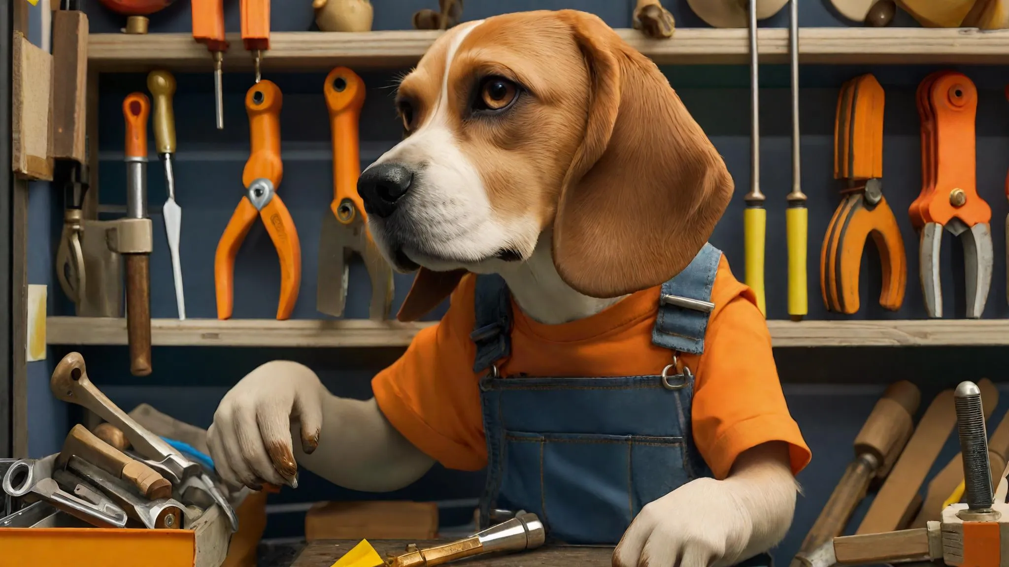Create a super-realistic 4K AI-generated image (3840x2160, 16:9) of an anthropomorphic beagle dog wearing an orange t-shirt and blue jeans, arranging tools in a hardware store window display. Perfect for marketing visuals or creative projects. Explore vivago.ai's AI tools for professional-grade anthropomorphic animal designs and immersive retail-themed digital art.