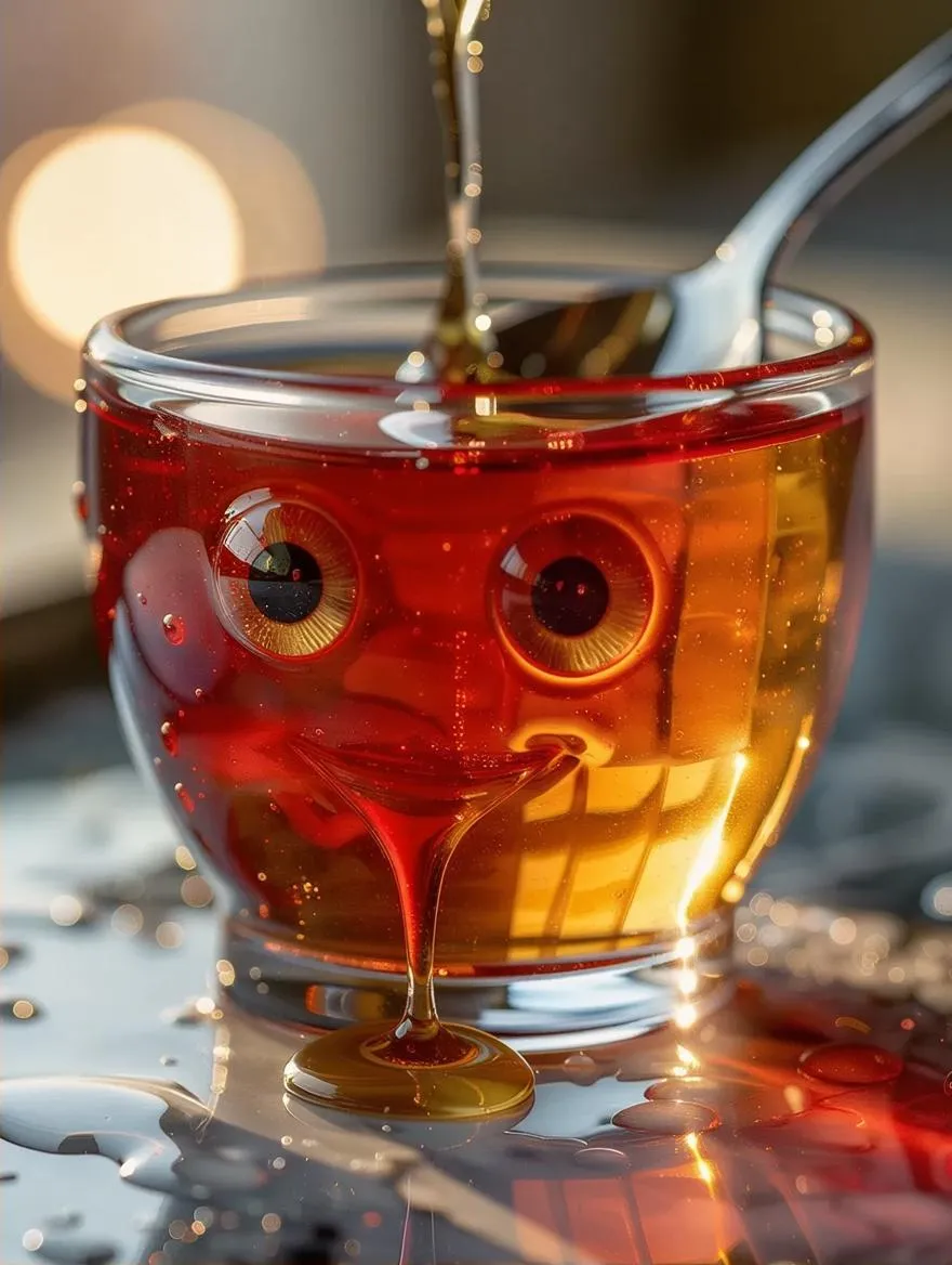 Transform text into surreal AI-generated visuals with hyperrealistic details. This bizarrely lifelike scene features a jello cup with glassy eyes, consuming itself amid glossy textures, ambient light refractions, and blurred surrealism. Vivid condensation, metallic sheen, and photorealistic clarity merge humor and unease—crafted by AI for striking, imaginative imagery that captivates with every gelatinous, quivering detail.