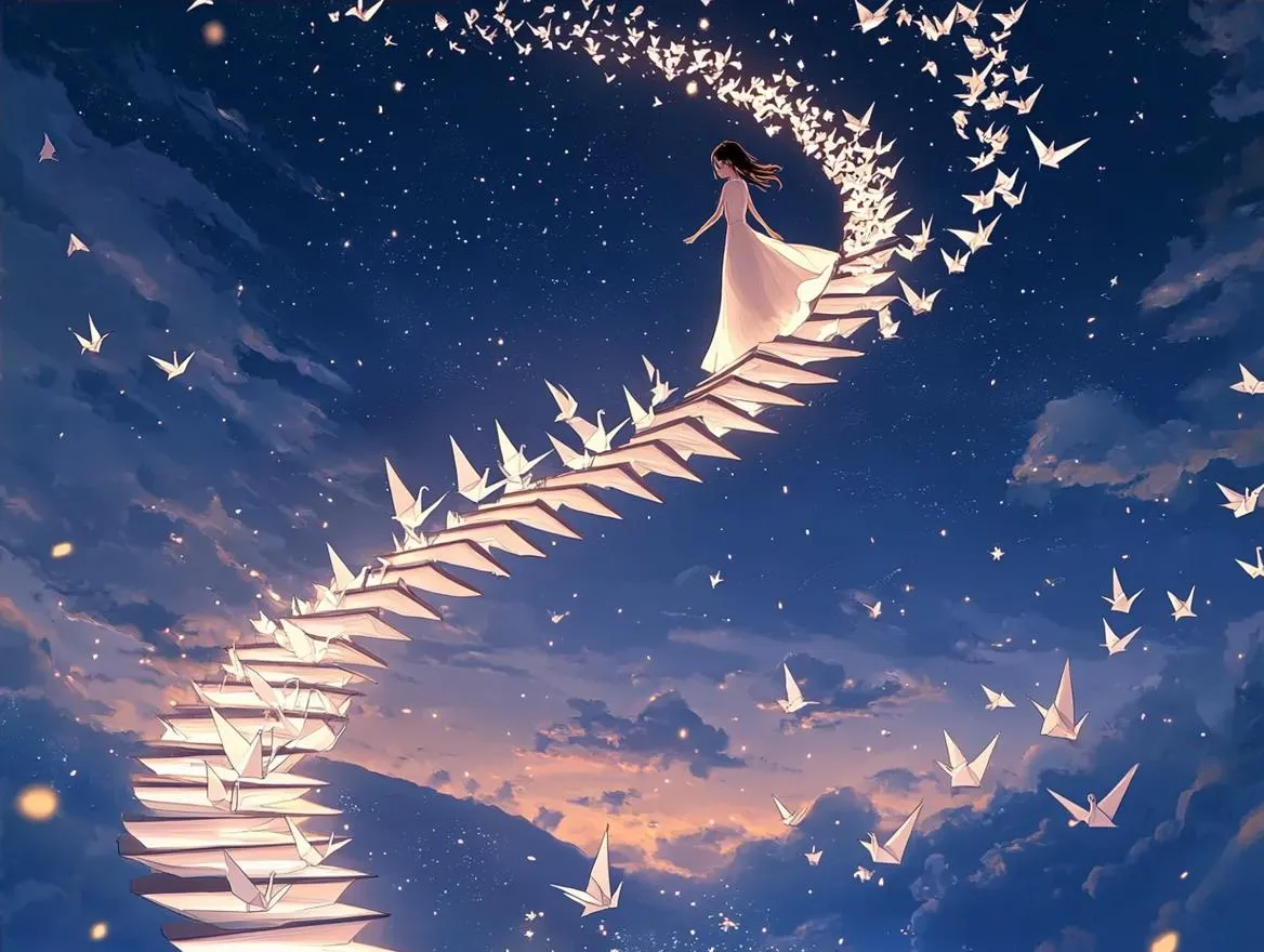 Experience a surreal anime aesthetic with a girl ascending a delicate paper crane staircase under dramatic contrast lighting. Fragile steps unfold, leaving luminous trails amidst falling stars. Create emotive, dreamlike scenes effortlessly using AI image generation tools for striking visual storytelling.