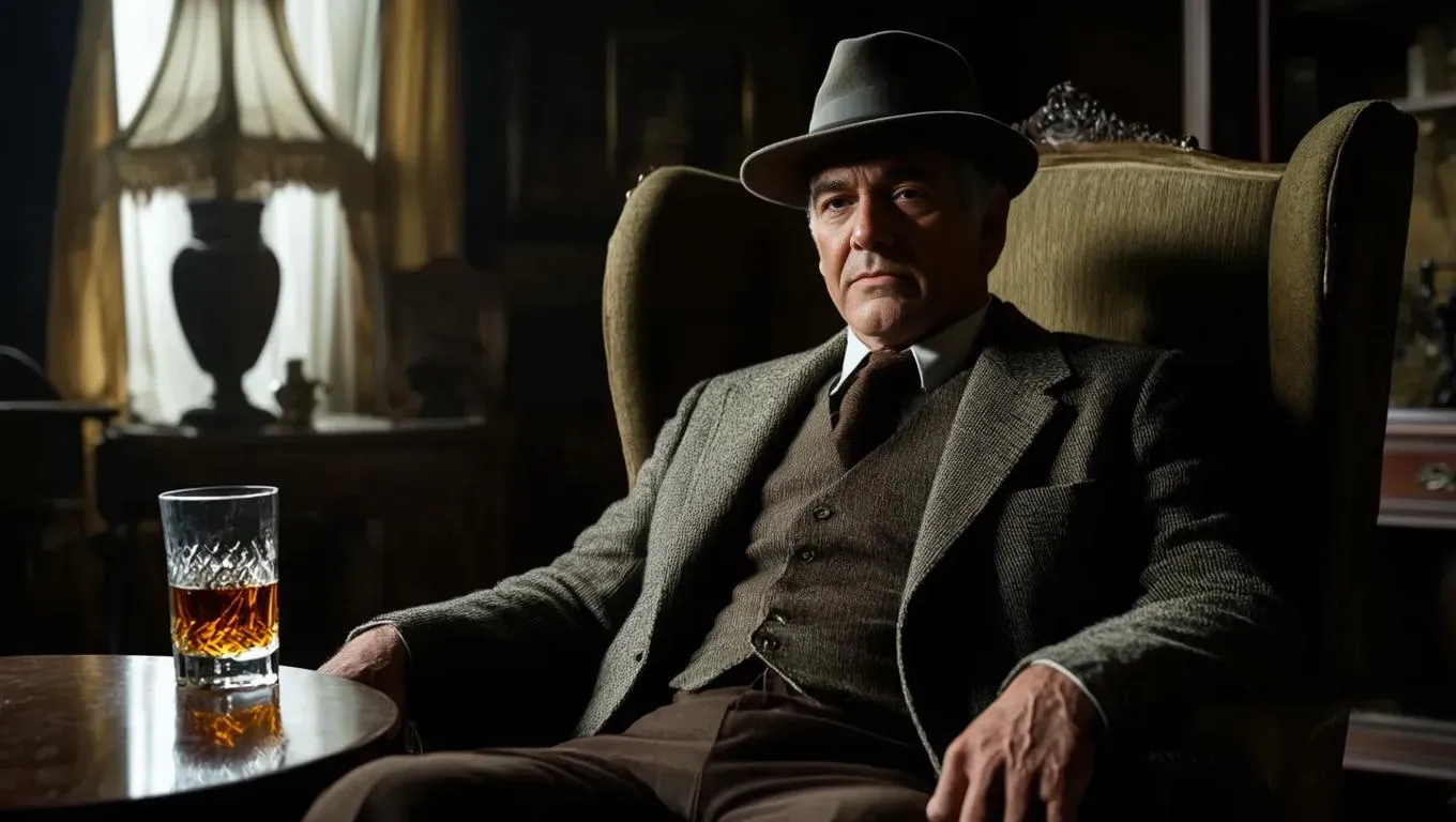Capture a 1960s mafia boss in ultra-HD detail: a pensive man in vintage attire sits in a dim, 19th-century room, half-full whiskey glass nearby. Dreamworks-style close-up highlights melancholy eyes, subtle smile, and gloom ambiance. Morning light accents period textures for cinematic suspense. Ideal for ultra-high-resolution profiles, blending nostalgic crime drama with ultra-realistic visual storytelling.