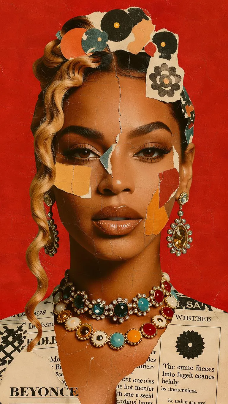 A striking vintage collage portrait of Beyoncé, crafted from eclectic magazine cutouts and torn paper textures. Her face emerges from a mosaic of whimsical, surreal fragments—eyes formed by vintage jewelry, lips from fashion ads, hair layered with cosmic motifs. Set against a bold matte red background, the composition balances minimalist elegance with editorial sharpness. The layering is deliberate yet playful, evoking Dada and Bauhaus influences. High contrast, tactile edges, and a smart visual rhythm create a sophisticated, avant-garde aesthetic that feels both iconic and handmade. Museum-worthy, with a strong visual punch.