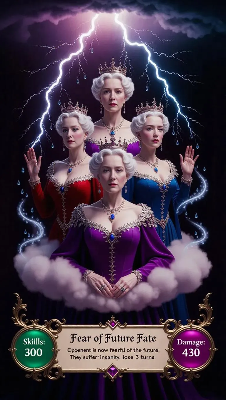 A majestic fantasy electric lightning storm conjures old and young versions of the same queen, adorned on a 3D dimensional game card. The card features a rectangle at the bottom with elegant fantasy text reading "Fear of Future Fate". Below, a description states "Opponent is now fearful of the future. They suffer from insanity, lose 3 turns". Bottom left circle with "Skills: 300". Bottom right circle with "Damage: 430". Surrounded by ethereal clouds, shimmering tears transforming into raindrops, intricate details, glowing aura, royal regalia, mystical realm backdrop, heavens, celestial light, and swirling mist.