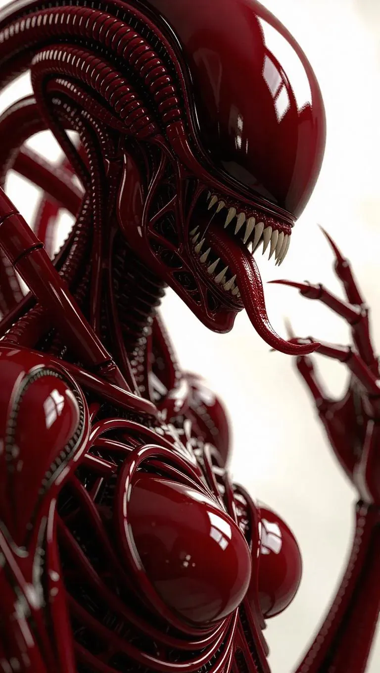 Create a striking AI-generated symbiotic alien with dark red tendrils, sharp claws, and a long symbiotic tongue. Realistic close-up of a feminine brunette fused with carnage symbiote textures, blending horror and beauty. Transform prompts into hyper-detailed visuals using vivago.ai's AI image tools for professional-grade sci-fi character art.