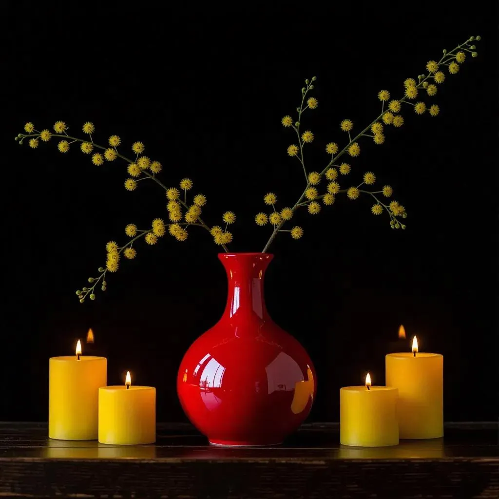 Generate stunning AI visuals with Vivago.ai: Realistic front-view photograph of a bulbous red vase holding yellow mimosa blooms, paired with glowing candles on dark wood. Black background intensifies chiaroscuro lighting and texture details. Perfect for artistic portfolios or decor inspiration. Experience immersive point-of-view composition powered by AI.