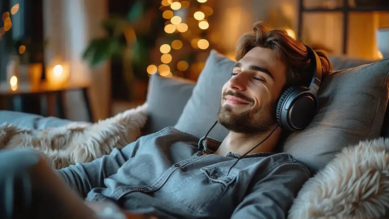 Generate a cozy AI image of a smiling man in headphones lounging on a plush sofa or bed, radiating relaxation. Perfect for music, meditation, or comfort-themed visuals. Elevate your content with vivago.ai's AI tools for professional-grade, serene scenes blending warmth and modern tech.