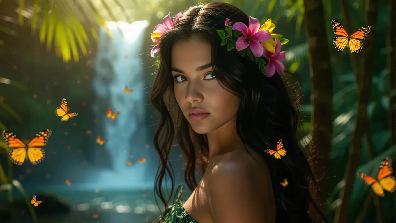Transform text into enchanting visuals with VivaGo.ai. Generate a mystical forest nymph with dark hair, glowing neon magic, jungle flowers, and cascading waterfalls. Perfect AI photography blending nature, soft sunlight, butterflies, and ethereal elegance. Elevate creativity with AI-powered image tools for professional, vibrant, and magical nature scenes.