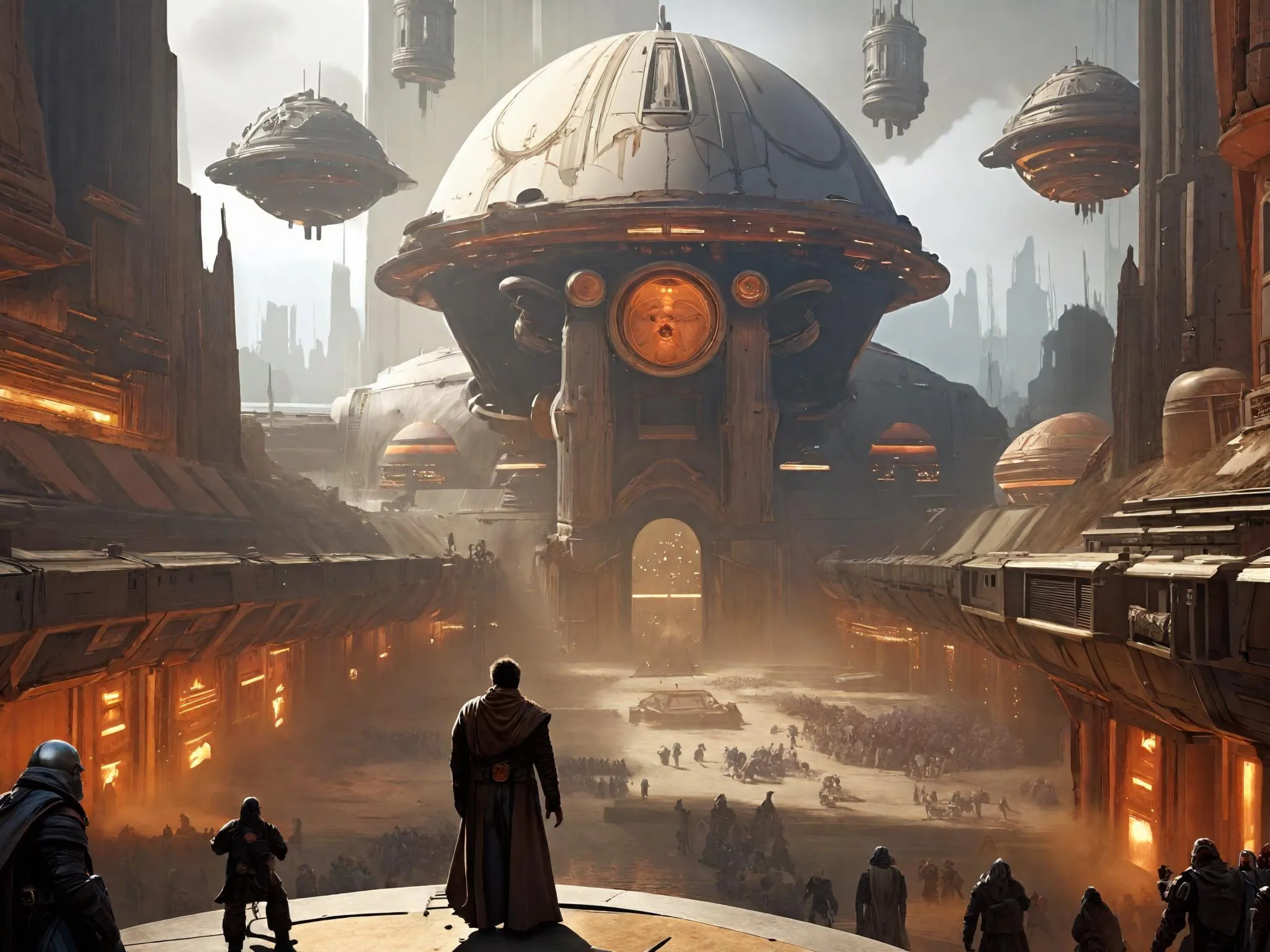 Experience an epic clash between Star Wars and Warhammer 40k universes with AI-generated 8K hyperrealism. Witness Jedi Master Obi-Wan Kenobi battling Horus Primarch of the Ultramarines amidst colossal sequoias in a steampunk-apocalyptic city. Craft cinematic visuals blending cinematic intensity, apocalyptic grandeur, and cross-fantasy warfare through AI-powered creativity at Vivago.ai—transform prompts into professional-grade art.