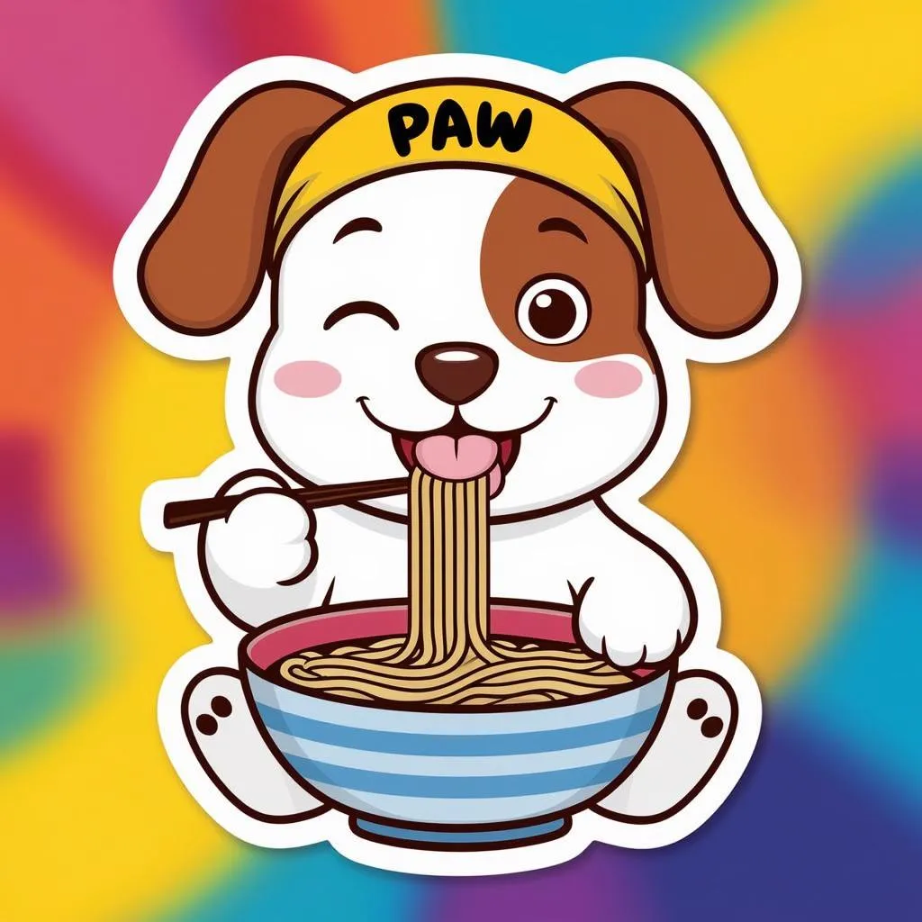 Create a playful AI-generated cartoon sticker featuring a cheerful white dog with a brown eye spot and ears, wearing a yellow "Paw" headband. Generate this charming character enjoying noodles in a full-body scene using vivago.ai's creative tools. Transform text prompts into vibrant visuals with professional AI effects for personalized stickers and dynamic digital art.