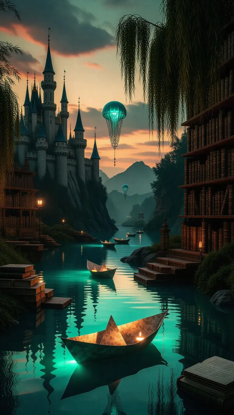 A winding turquoise river glows under a sky that shifts from dawn to dusk, casting ethereal light. Abandoned paper boats carry handwritten dreams, drifting past ruins of giant quills, feather towers, and stone books cracked open with vines. Glass deer drink from the water, while jellyfish float like airborne balloons. Silver-leaved willow trees weep, releasing memories as glowing pollen. In the distance, a castle of stitched fabric and stained glass stands silent and watchful.