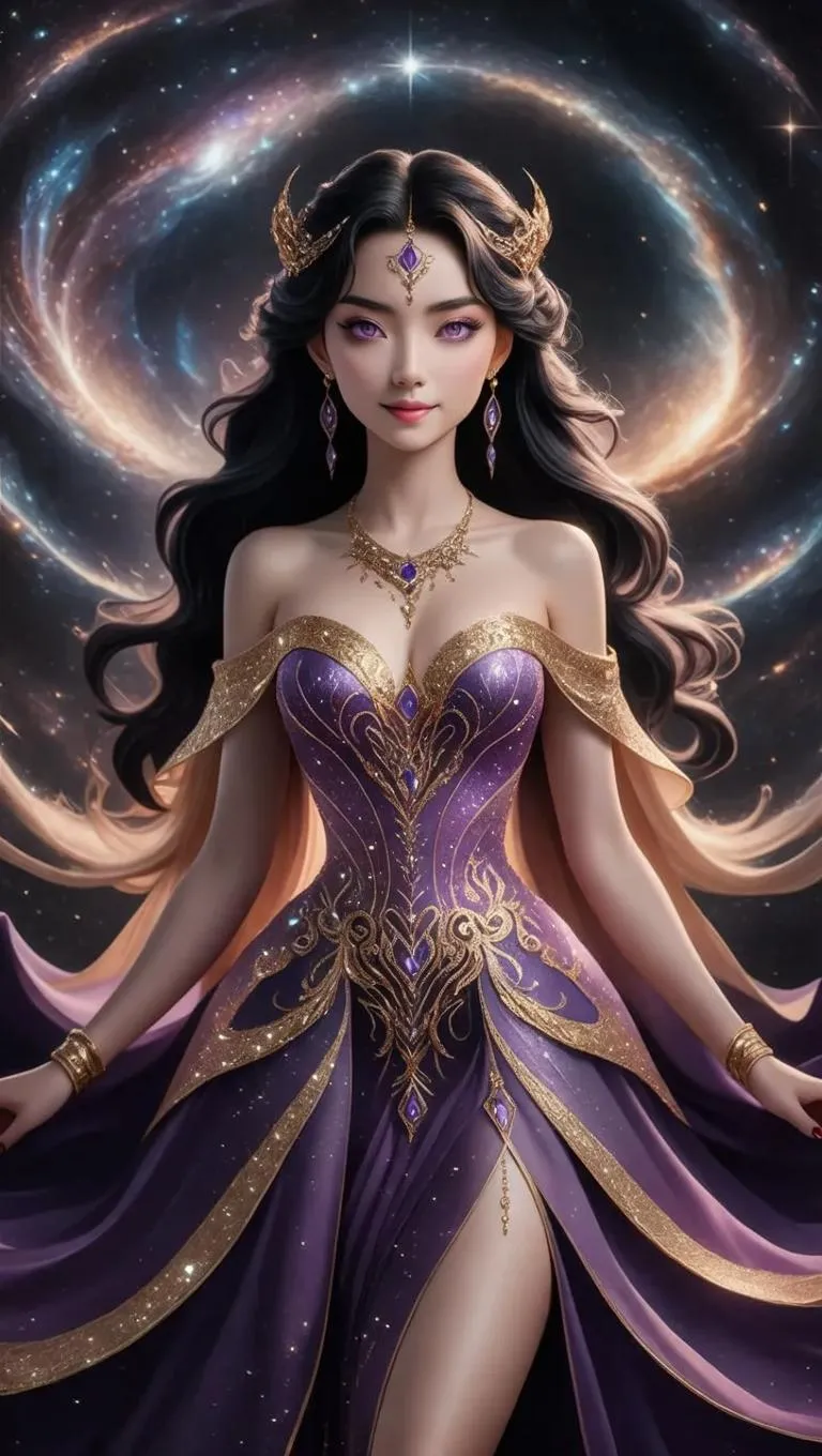 Create enchanting AI-generated fantasy art with a mystical celestial woman featuring captivating purple eyes, a luxurious purple and gold gown, and celestial jewelry. Set against a cosmic starry backdrop with glowing lights, this ethereal portrait embodies magical elegance and otherworldly beauty. Perfect for mystical themes, powered by vivago.ai's advanced AI artistry.