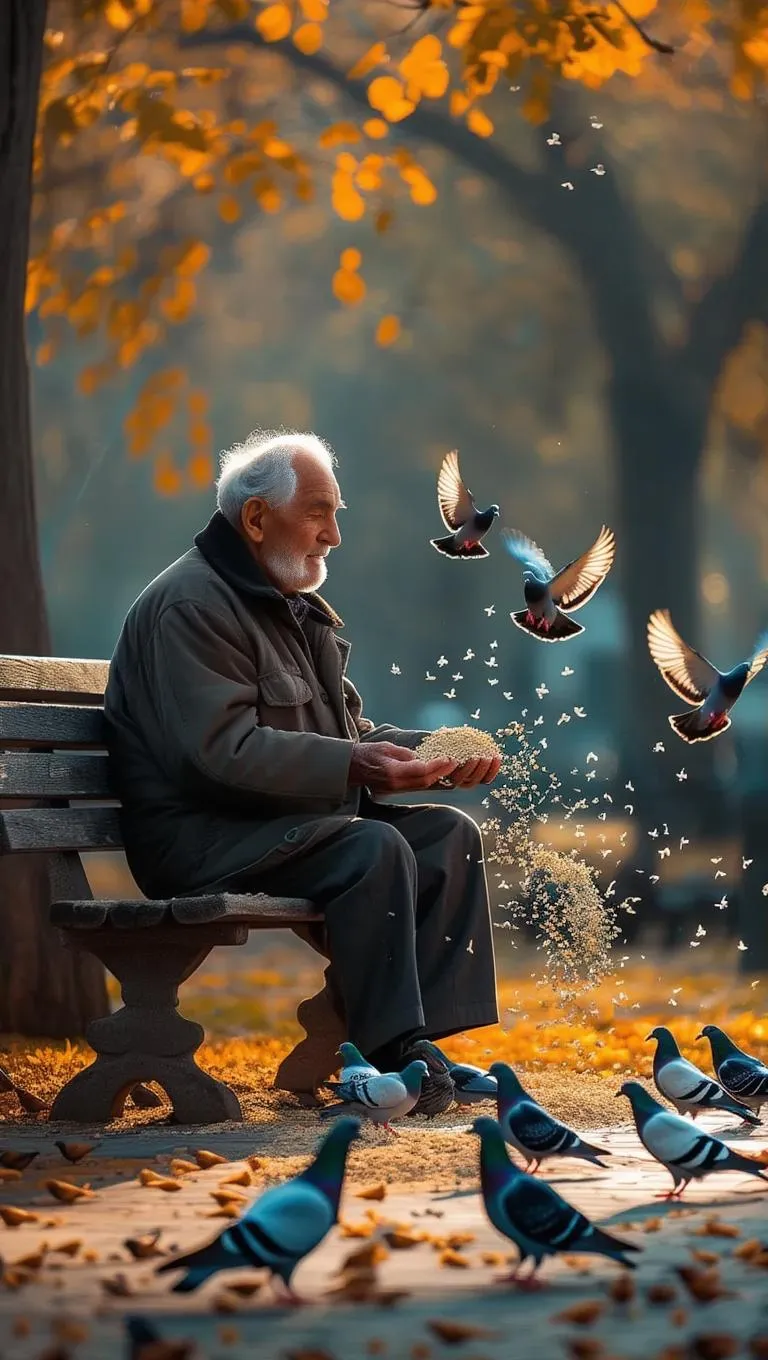 Generate a heartfelt scene of an elderly man feeding birds on a park bench with VivaGo's AI tools. Create lifelike visuals of gentle interactions between humans and nature, perfect for storytelling or nostalgic projects. Transform simple prompts into warm, detailed images with professional AI artistry.