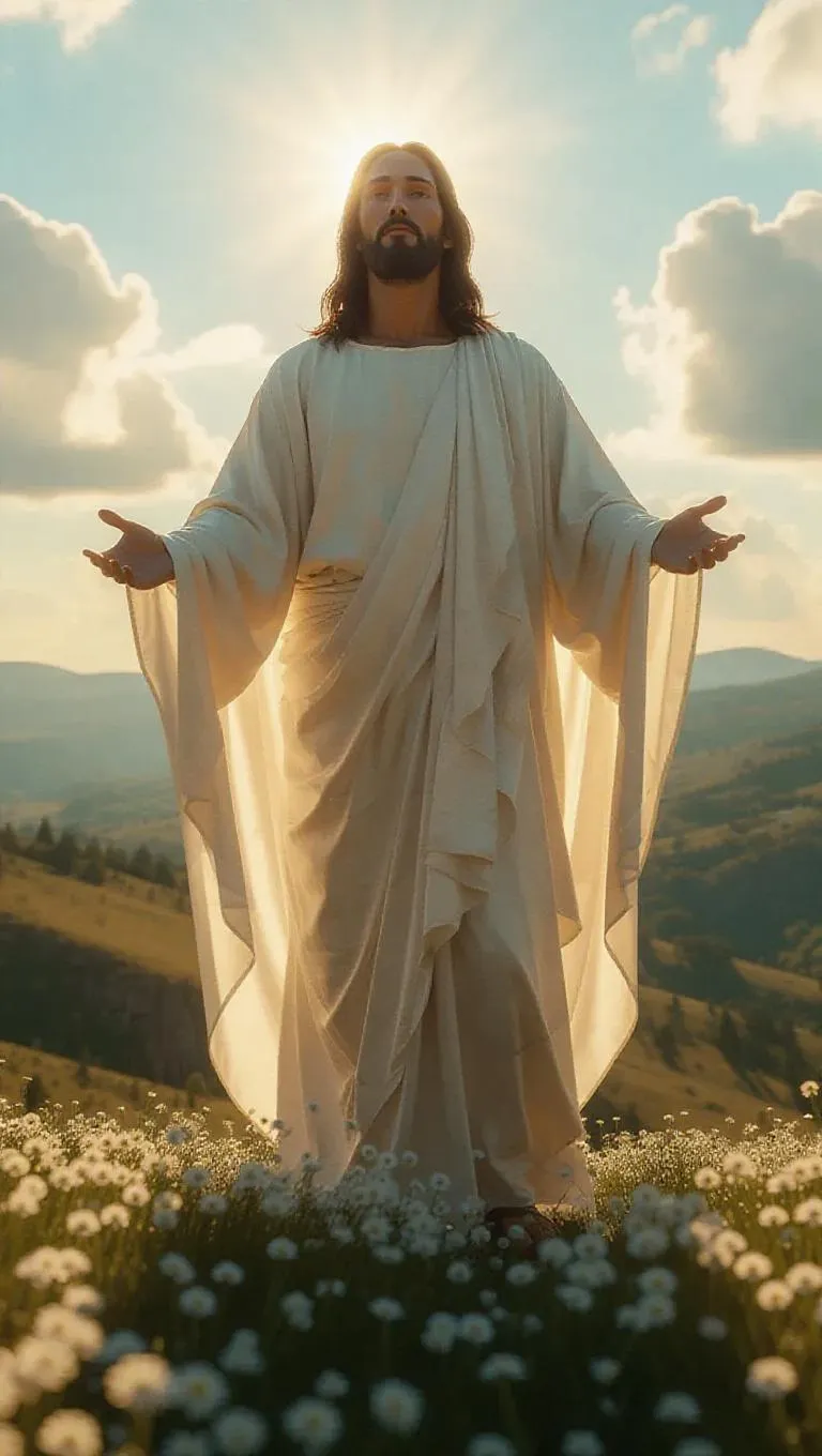 Transform text into divine visuals with AI. Generate serene Jesus imagery featuring cinematic wide-angle landscapes, hyper-detailed textures, and Renaissance chiaroscuro. Create luminous robes, golden halos, dewy wildflowers, and ethereal glow in 8k resolution. Perfect for spiritual art, religious content, and heavenly scene creation with soft volumetric lighting.