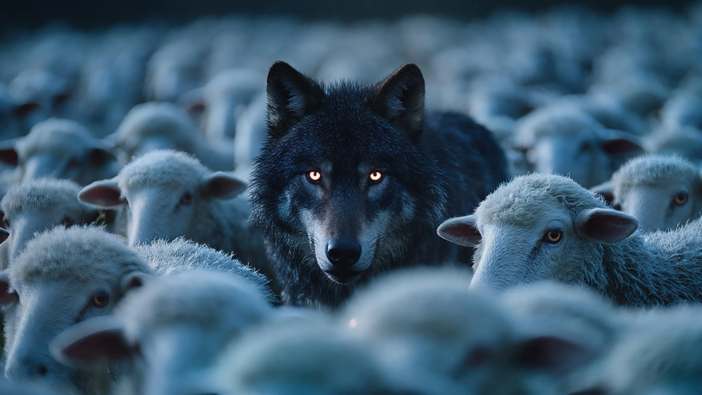 Create striking AI-generated cinematic scenes of a lone black wolf emerging from a white sheep herd. Capture menacing, glowing eyes under moonlight, sharp focus on the wolf's sinister stare while oblivious sheep graze. Transform your dark vision into realistic, dramatic visuals with professional AI image generation at vivago.ai. (56 words)