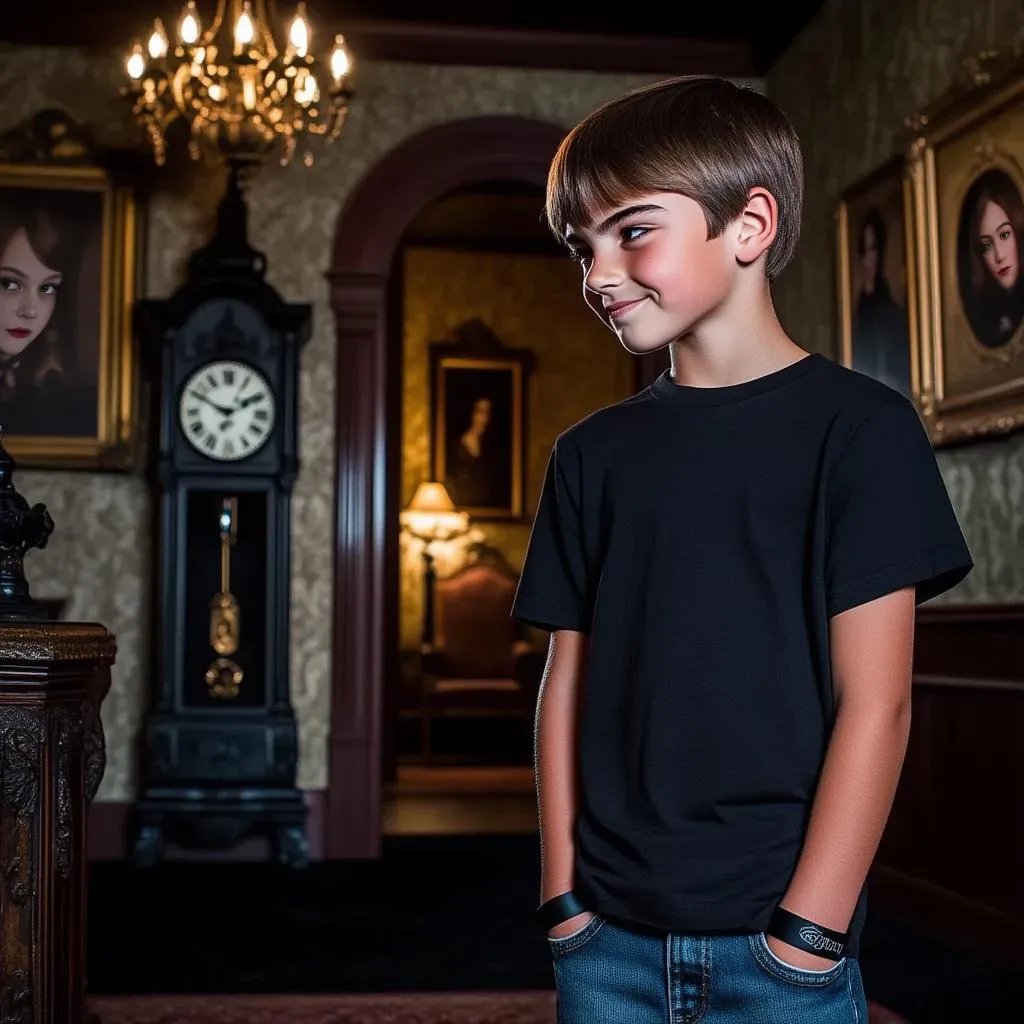 Hyper quality AI image: A smug youngster in a black t-shirt, jeans, and wristband silently mocks a trapped intruder. Featured brown bob cut hairstyle, broad forehead, and high cheekbones against a gothic hotel backdrop. Dim antique lighting reveals mysterious portraits and grandfather clock in this eerie vintage scene.