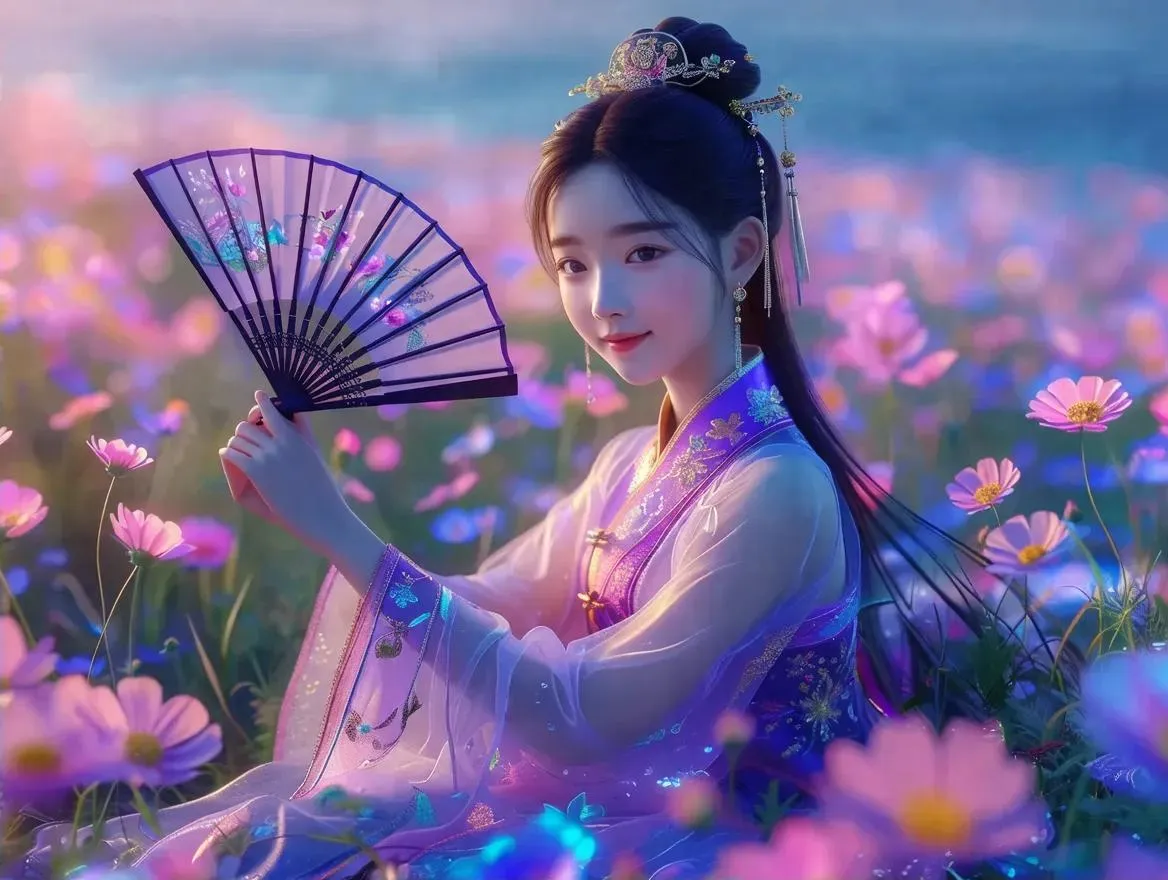 Create stunning AI-generated visuals of a graceful Chinese girl in a vibrant flower field, blending traditional elements with sci-fi neon lighting. Vivago.ai crafts ultra HD 8K renders featuring luminous chiffon textures, glowing hair, and cinematic fluorescence effects for professional-grade fantasy character art. Explore AI-powered 3D rendering for ethereal full-body portraits with photorealistic grassland environments.