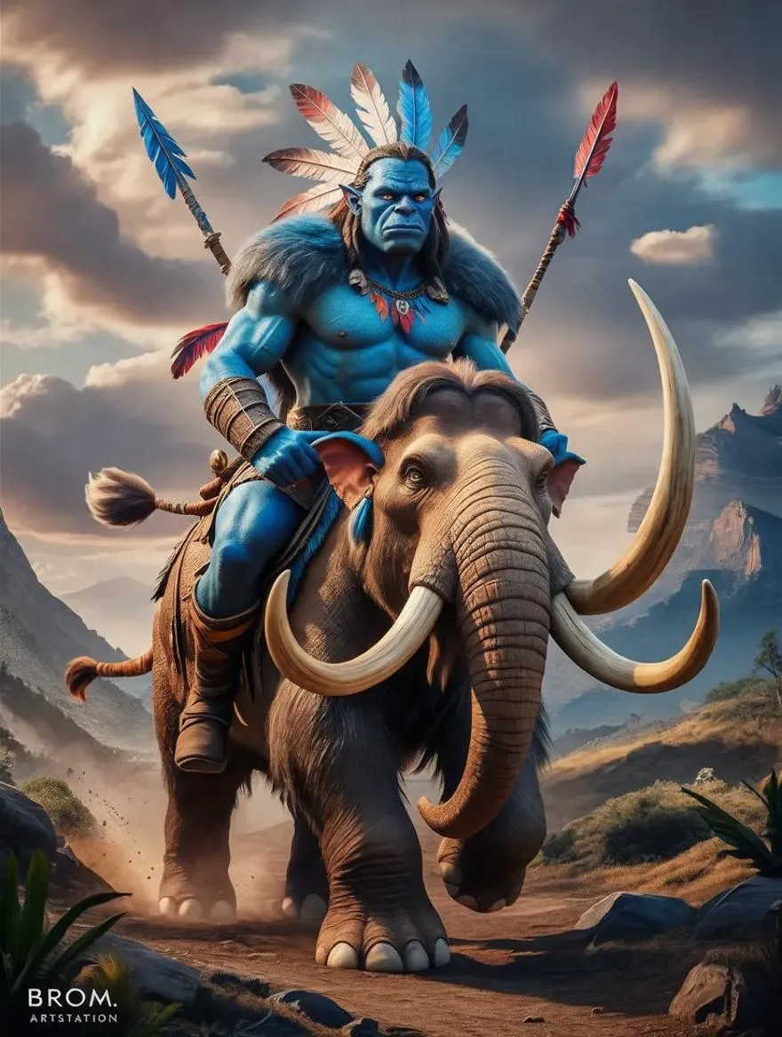 Generate hyper-realistic AI art of a blue orc warrior riding a sharp-tusked mammoth with vivid colors, 8K resolution, and dramatic Unreal Engine 5 lighting. Explore trending concept art, digital masterpieces, and epic splash art designs for professional AI-generated visuals. Ideal for fantasy enthusiasts seeking ultra-detailed, cinematic AI imagery.