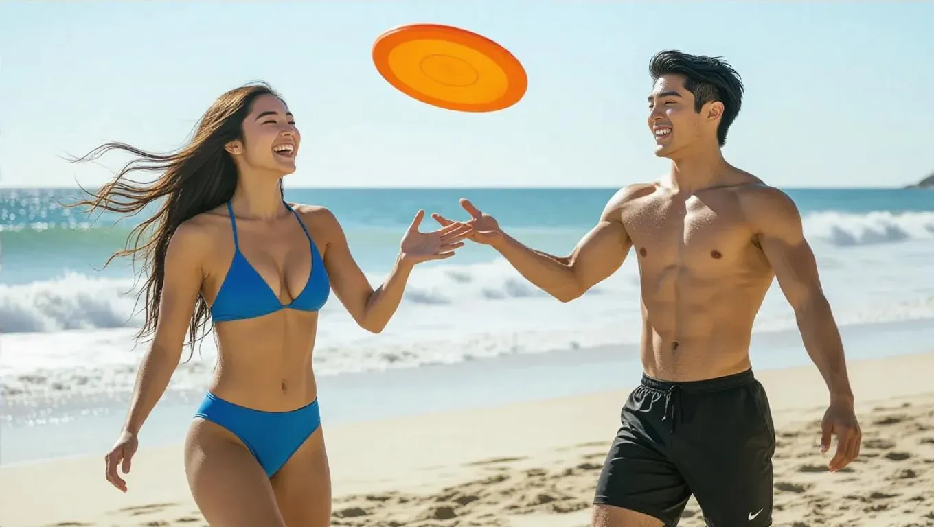 Capture vibrant summer energy with this AI-generated scene of an athletic young couple playing frisbee on a sun-kissed beach. Their toned physiques, stylish swimwear, and joyful expressions embody carefree warmth. Dynamic frisbee action, crashing ocean waves, and golden sunlight create a lively coastal atmosphere perfect for fitness, romance, or summer lifestyle visual storytelling.