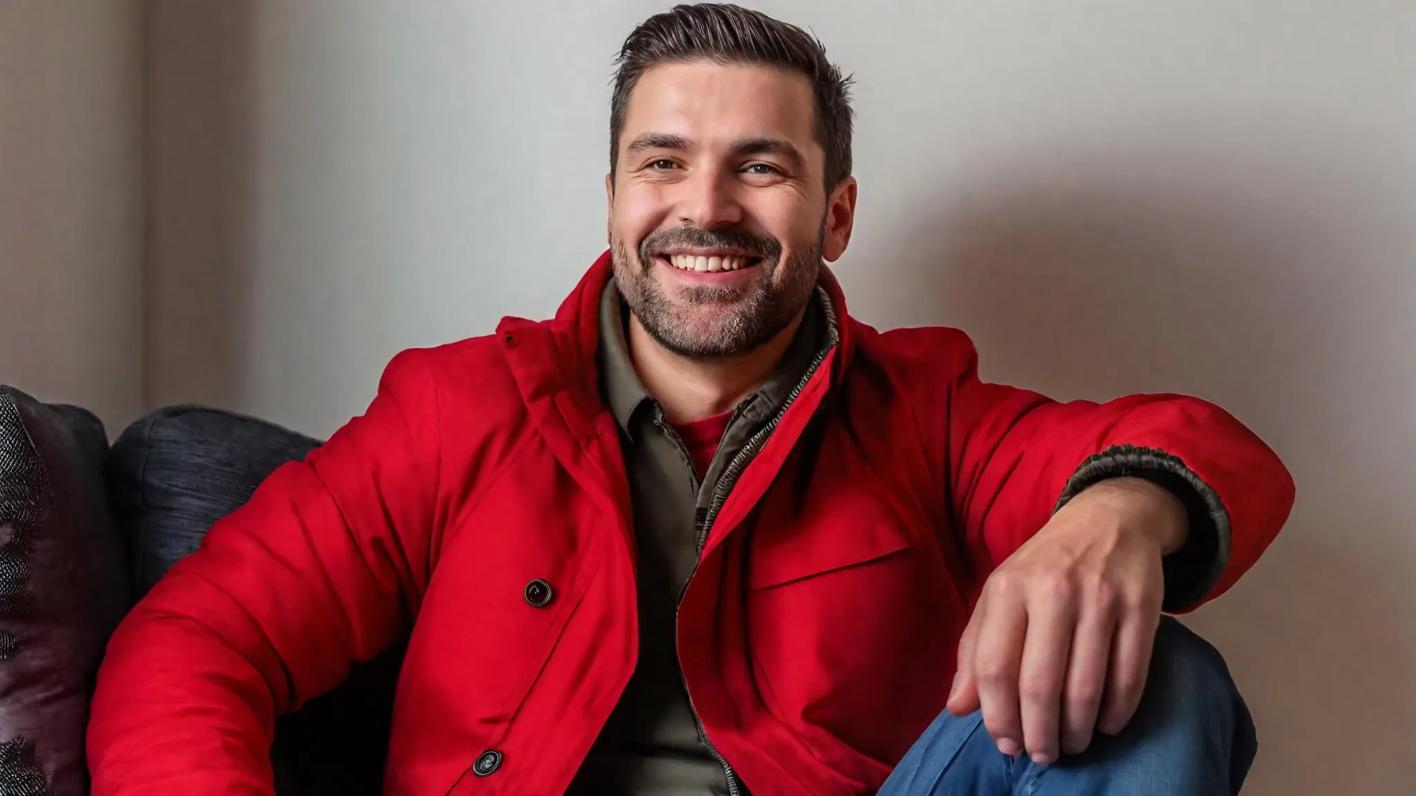 Generate AI images of a man in a vivid red winter jacket sitting on a sofa, smiling at the camera with hands in pockets. Create cozy, happy indoor portraits using AI tools for professional lifestyle visuals, seasonal fashion content, or expressive character scenes. Perfect for ads, social media, or personalized AI art projects.
