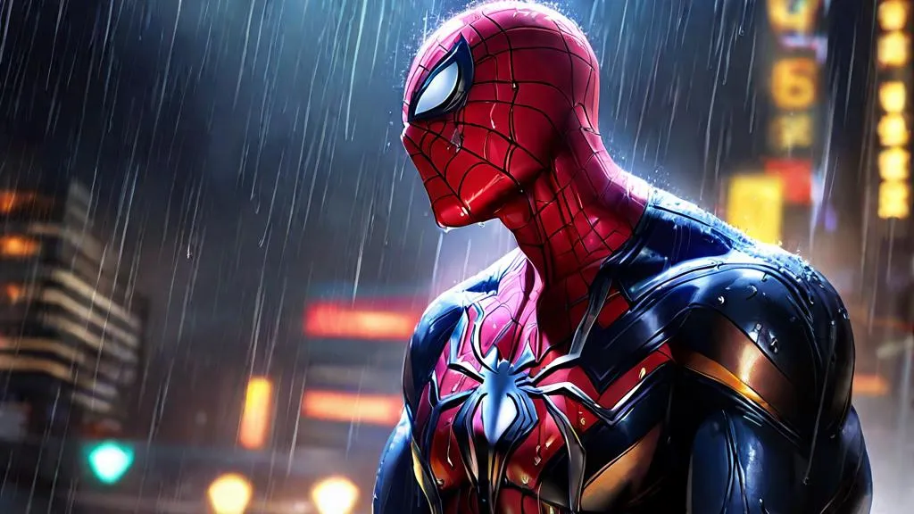 Transform text into visuals with our AI image generator. Create a photorealistic Marvel-style scene of Spider-Man on a rainy skyscraper, his reflection as Venom. Cinematic lighting, neon cityscape, and dramatic atmosphere for professional-grade results.
