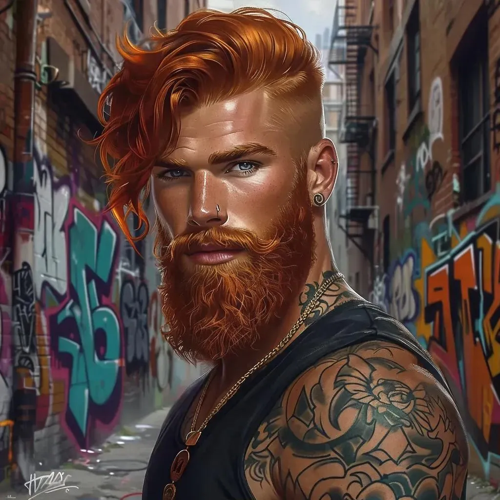 Create a bold AI-generated portrait of a bearded red-haired man with detailed tattoos using vivago.ai. Transform text prompts into striking visuals with precision AI tools, lifelike details, and dynamic effects for captivating character design. Ideal for digital art, storytelling, or branding projects.