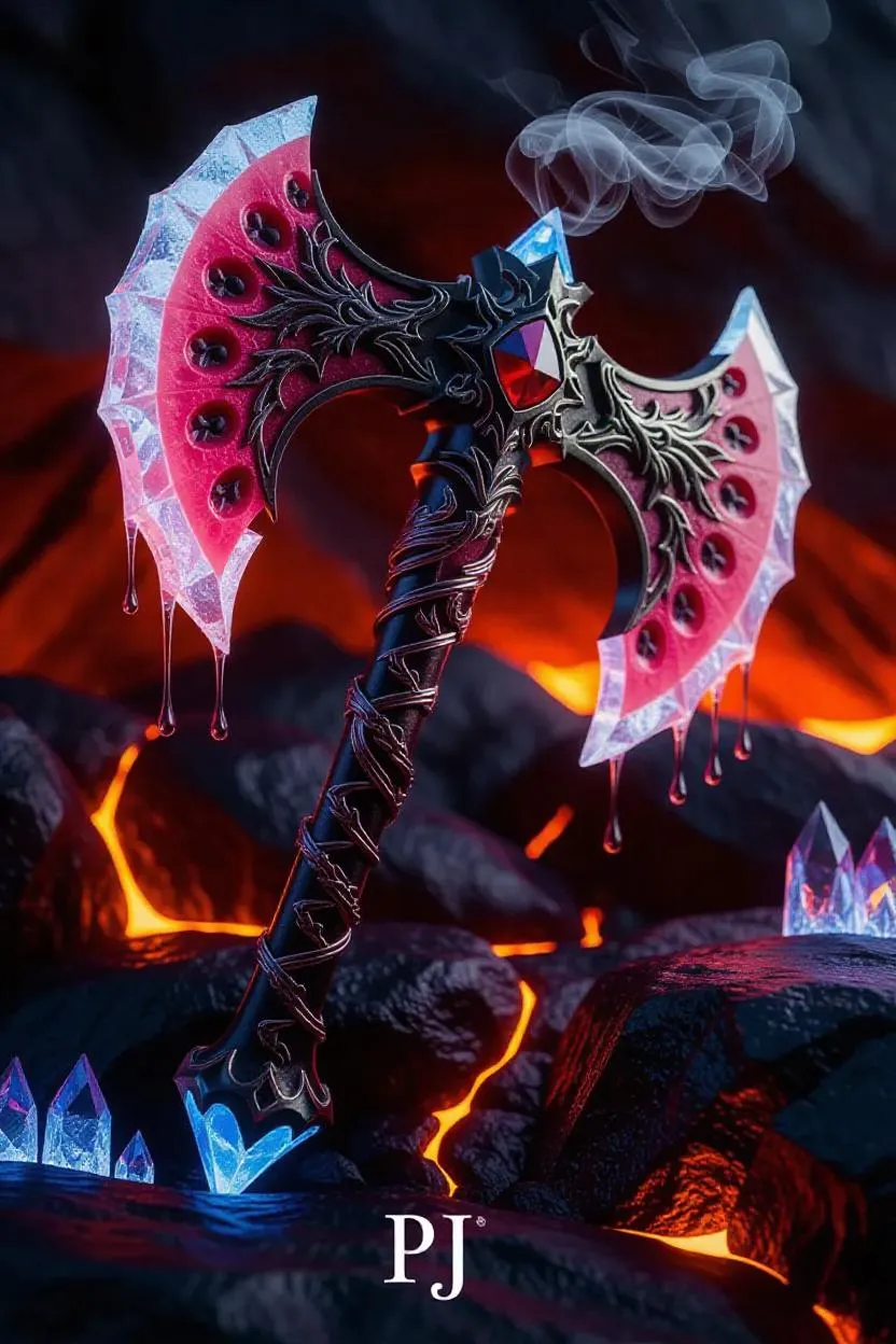 An ultra-detailed Polyart portrait (2:3) of a colossal fantasy battle axe with translucent blades carved from frozen watermelon rind, frosted surface revealing swirling ruby seeds like captured fireflies. Jagged edges drip luminous crimson juice, sizzling against steaming volcanic rocks, creating glowing smoke tendrils. Icy blue aura clashing with ambient magma glow, light refracting through diamond-clear ice formations on the obsidian haft. Embedded rubies pulse with inner fire, casting fractal shadows over intricate frost dragon carvings on the pommel. Hyper-realistic textures - crackling ice, beaded condensation, glowing juice trails slicing through ashen battlefield smoke.