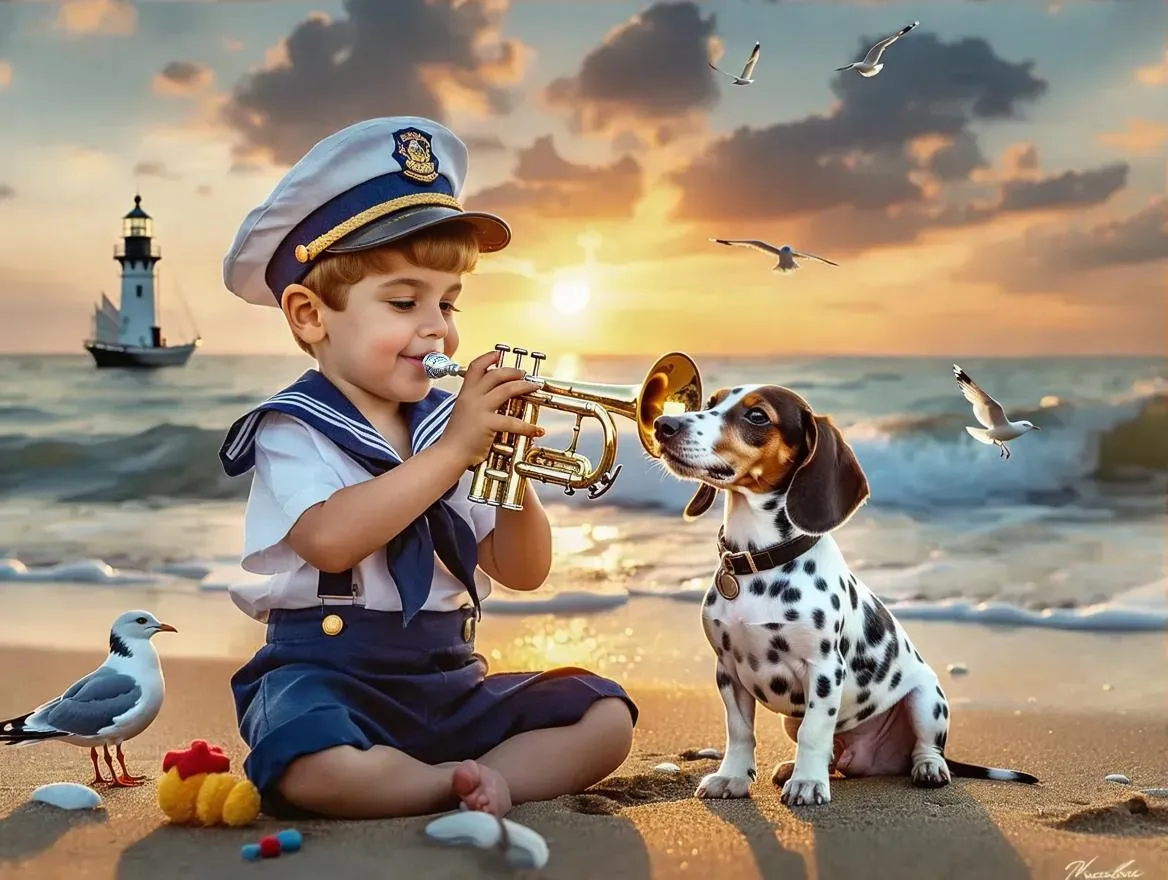 AI-generated realistic beach sunset scene: A boy in a sailor suit plays a trumpet on a beach, accompanied by a dachshund in a tiny sailor hat holding a toy trumpet. Seagulls, a lighthouse, and distant ship enrich the detailed coastal backdrop. Perfect for vibrant, imaginative visuals with AI-powered photorealism.