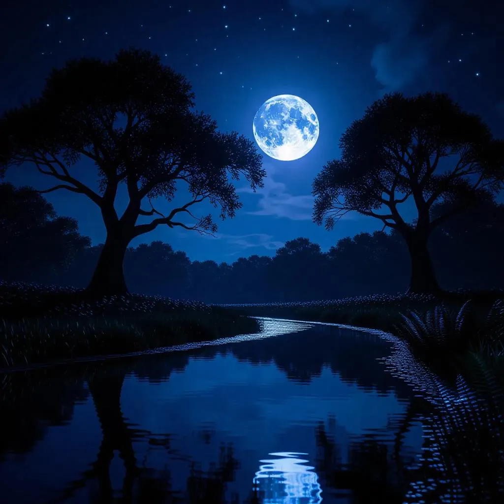 Capture a serene nightscape with AI-generated ultra-detailed 8k imagery. Ancient oaks, a moonlit river, and twinkling stars reflect in crystal waters. Cinematic lighting, cool tones, and ethereal atmosphere enhance this wide-angle wilderness. Fireflies add golden specks to lush ferns and wildflowers. Create celestial beauty with vivago.ai's AI image tools.