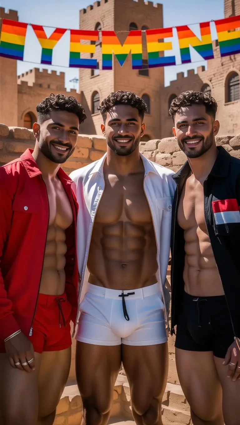 Transform text into stunning AI visuals with our generator. Experience high-fashion imagery: three muscular Yemeni men in Yemen flag-colored shorts on a Sana'a rooftop. Captured in intense rainbow light, shallow DOF, featuring rich textures. Ideal for vibrant, professional-grade AI-generated photography.