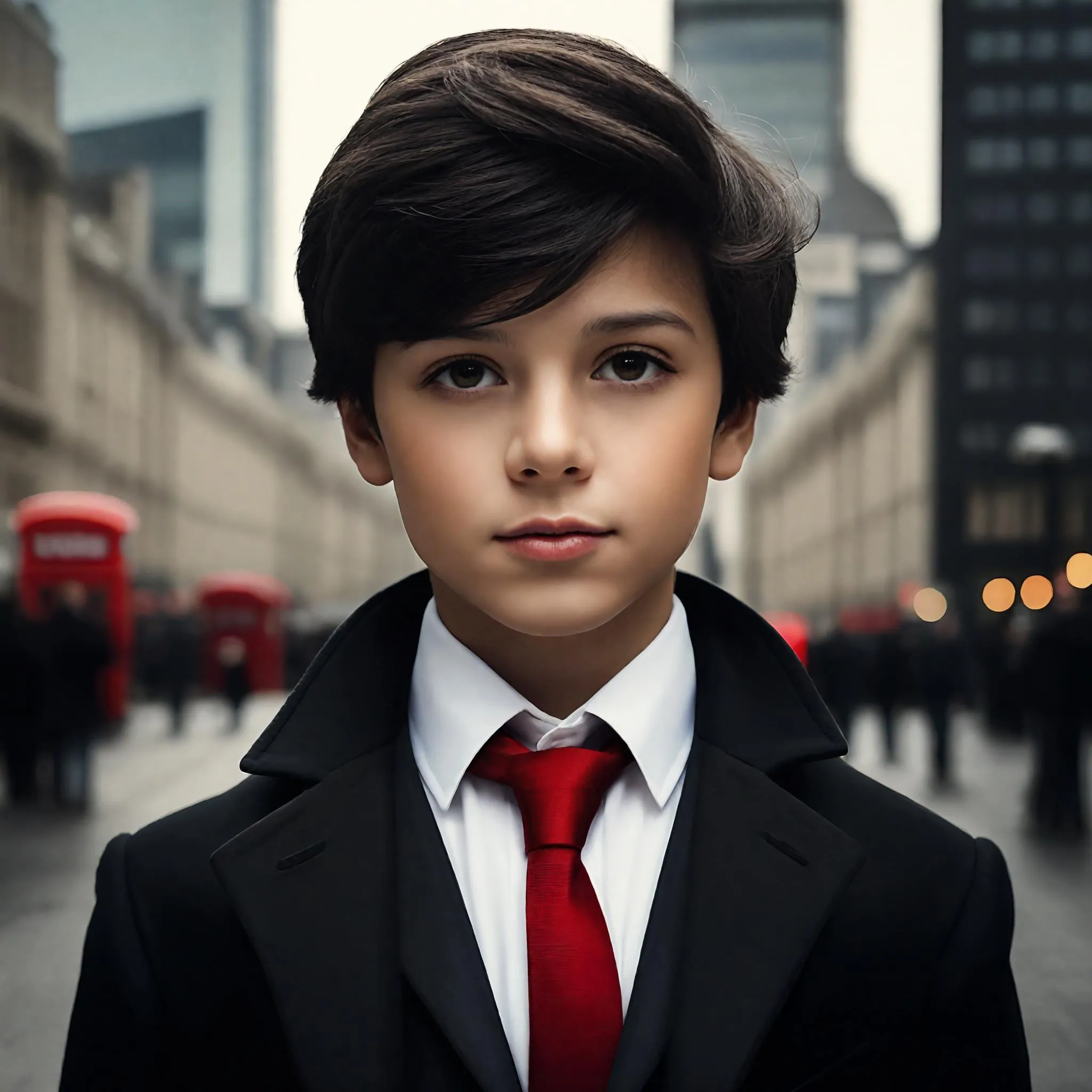 Create a stunning AI-generated image of a handsome boy in a sleek black coat, white shirt, red tie, and pants with black hair and eyes. London's iconic landmarks blend into the background, crafted with vivago.ai's advanced AI tools for realistic, professional visuals perfect for creative projects and digital content.