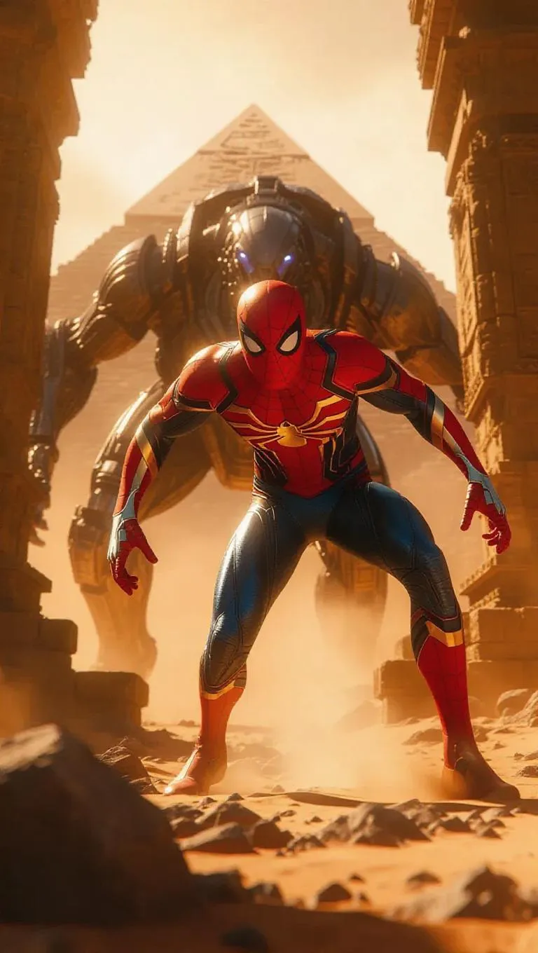 Generate a cinematic Spider-Man vs. mecha battle in desert ruins with thick paint textures, sandstorm dynamics, and 350dpi details. AI-powered tools create RGB sunset-metal contrasts, pyramid shadows, and realistic wear effects. Avoid cartoonish designs or desaturation—craft professional-grade visuals blending cinematic grit, sand particle precision, and dynamic combat framing.