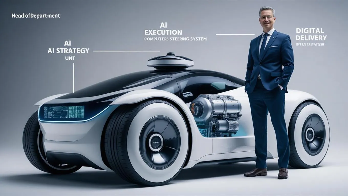 Visualize departmental synergy with this AI-powered electric car: AI Strategy steers as the computer system, AI Execution propels via wheels, and Digital Delivery powers the engine. The Head of Department integrates units seamlessly. Professional, realistic imagery for team alignment and executive insights on AI-driven innovation, strategy, and operational excellence.