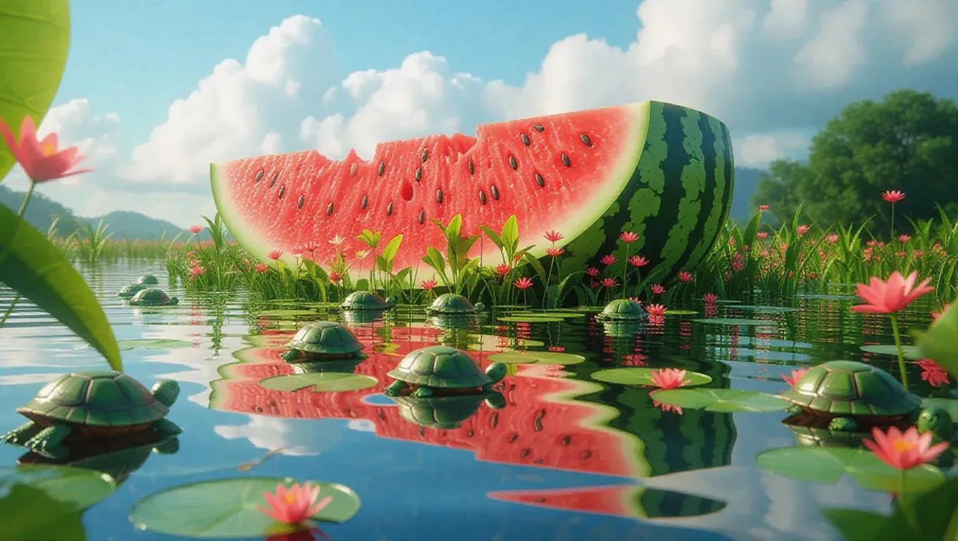 Create a Studio Ghibli-inspired AI fantasy landscape: watermelon-shaped island with juice rivers, kiwi turtles, mango lily pads, and nostalgic childhood picnic vibes. Hand-drawn color pencil textures, painterly brushstrokes, and soft lighting evoke dreamy, whimsical worlds. Explore AI image generation for imaginative, edible-themed scenes.