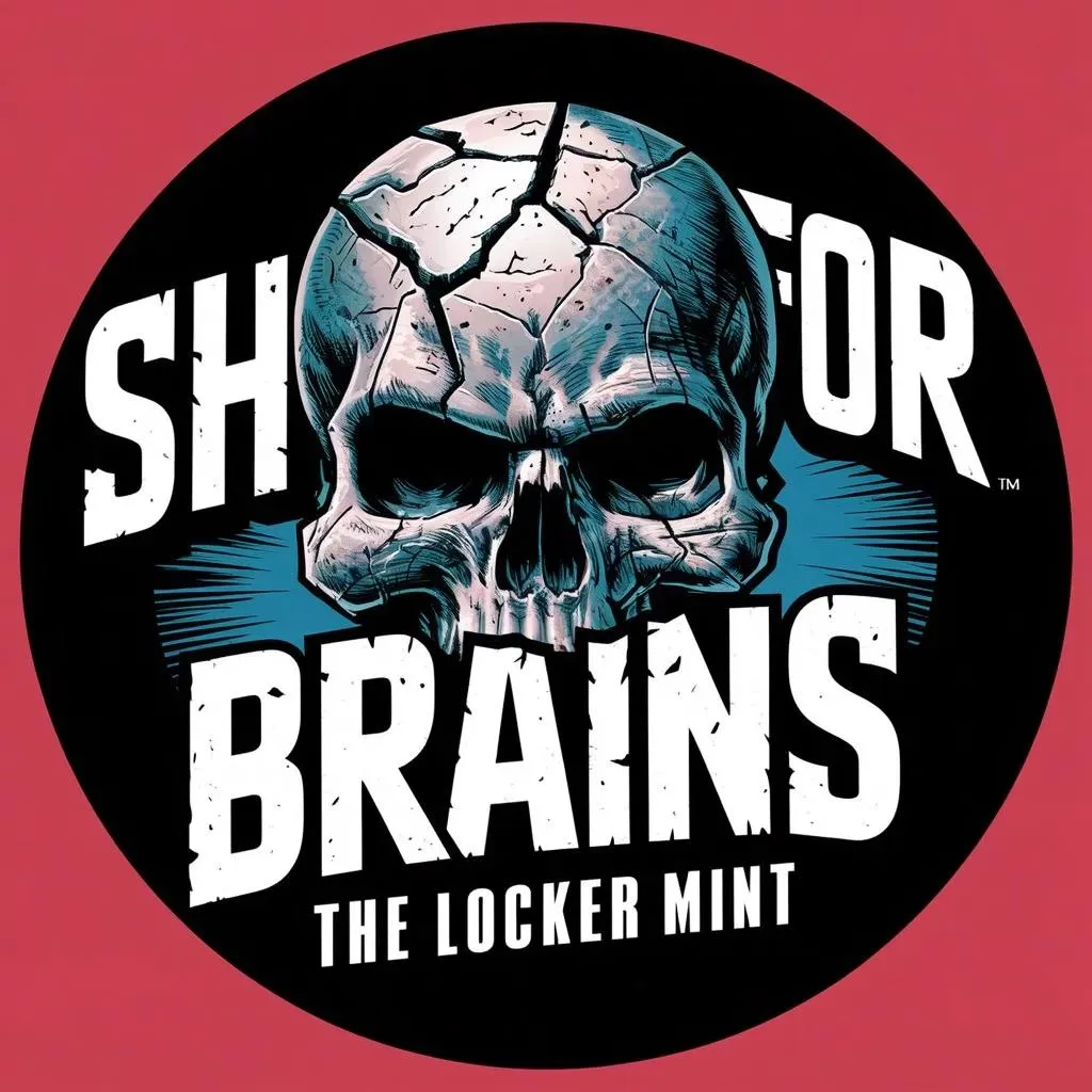 Create a bold comic book-style circular logo with "SHOT FOR BRAINS" and "The Locker Mint" subtext using vivago.ai. Generate vivid, realistic AI art featuring a weathered, cracked ominous skull with coarse textures against a solid black backdrop for edgy branding or graphic design projects.