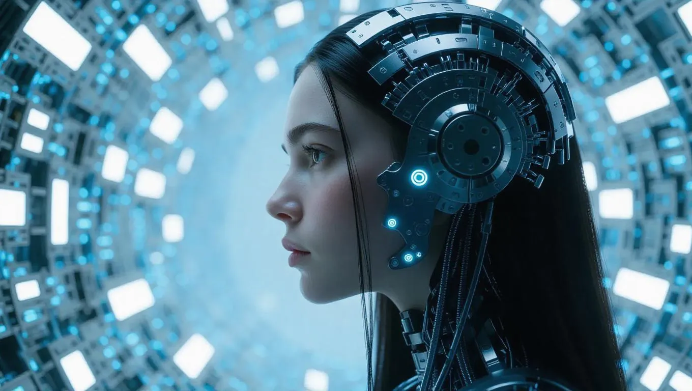 Explore AI-generated cyberpunk art with this portrait of a woman blending organic beauty and futuristic cybernetic implants. Detailed mechanical elements, glowing blue accents, and industrial backgrounds create a high-tech, immersive aesthetic. Experience vivago.ai's advanced AI tools for transforming prompts into striking visual narratives, merging human elegance with cutting-edge technology in dynamic, professional-grade imagery.