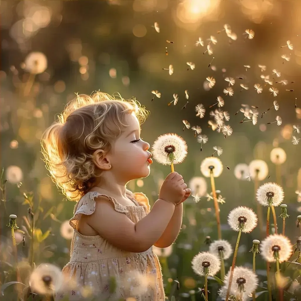 Capture the magic of childhood with AI-generated images of a child blowing dandelion seeds. Serene outdoor scenes feature warm lighting, soft focus, lush greenery, and whimsical charm. Perfect for evoking innocence, playfulness, and nature's beauty. Ideal for creative projects seeking dreamy, ethereal visuals with gentle breezes and heartfelt moments.