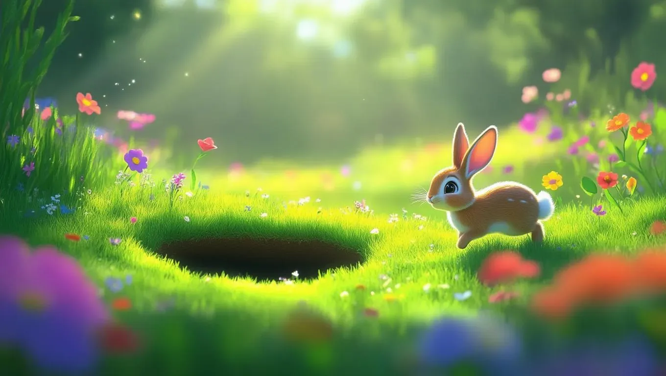 Generate a vibrant AI cartoon scene of a sunlit meadow with soft grass, rabbit burrows, and blooming flowers. Perfect for animations or children's stories, create whimsical rabbit habitats using professional AI image tools for colorful, playful visuals.