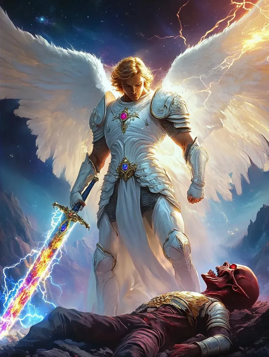 AI-generated art of Archangel Michael in radiant white armor, wielding a jeweled electric-fire sword against a demon. Photorealistic cosmic backdrop, galactic landscapes, and dramatic lighting highlight divine triumph. Explore celestial battles with Vivago.ai's AI effects for stunning, hyper-detailed angelic warrior visuals.