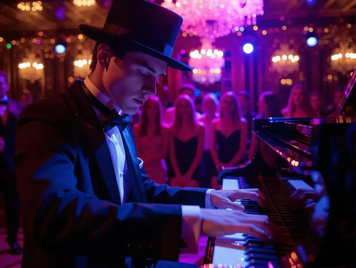 Generate a dynamic AI image of a stylish young pianist in a sharp tuxedo and pork pie hat, passionately performing in a neon-lit nightclub. Vivago.ai transforms text prompts into vibrant visuals, perfect for music-themed art, fashion-forward scenes, or energetic entertainment storytelling. Create professional-grade imagery with AI precision.