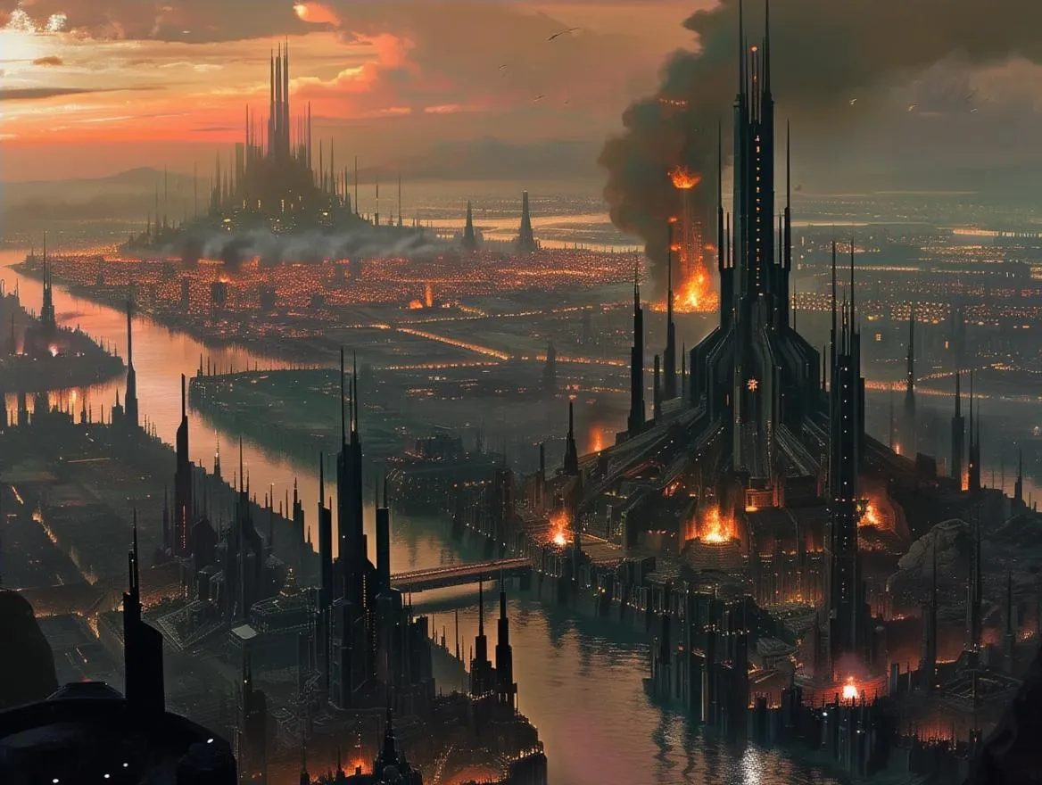 Explore a Warhammer 40k-inspired spire city map: oval-shaped metropolis with governmental spires, dark habitation blocks, fiery industrial forges, a river harbor, grand cathedral-palace complexes, and a colossal disc-structured spaceport. AI-generated imagery brings this dystopian landscape to life, blending grimdark architecture, strategic zones, and intricate Warhammer 40k terrain details for immersive worldbuilding.
