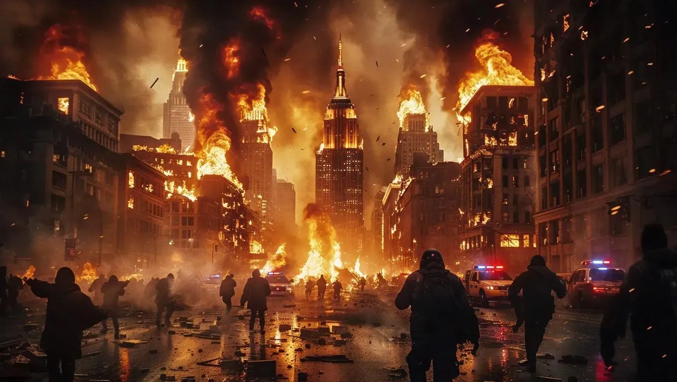 Craft hyper-realistic AI visuals of a chaotic city engulfed in flames with intense riots using vivago.ai. Transform text prompts into dystopian scenes with dynamic AI effects, capturing rebellion, fire, and mass protests for professional-grade, high-detail chaos imagery.