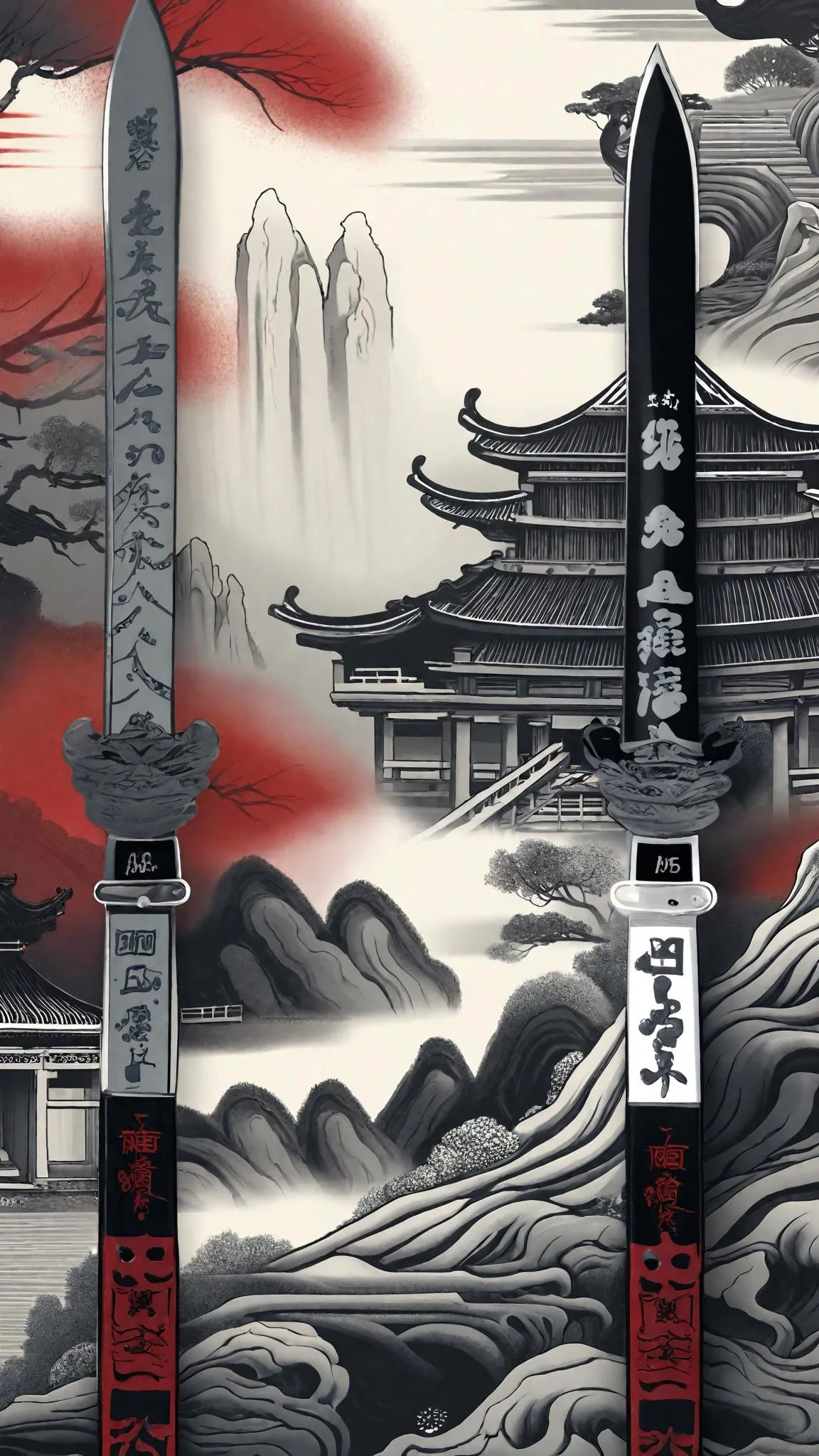Psychedelic, only red black grays and whites Japan ornate topography of old scripts and pictures of ancient Japan swords smith