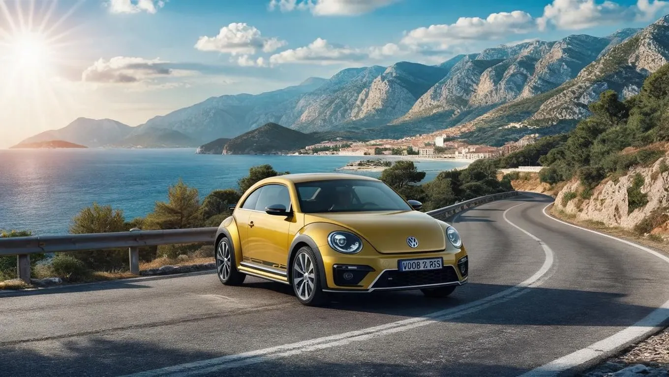 Generate a high-definition AI image of a bright yellow Volkswagen Beetle cruising Montenegro's winding roads, framed by lush green mountains and sunlit Adriatic Sea vistas. Realistic sunny day scene with clear blue skies, soft clouds, and vibrant details for professional-grade visual storytelling.