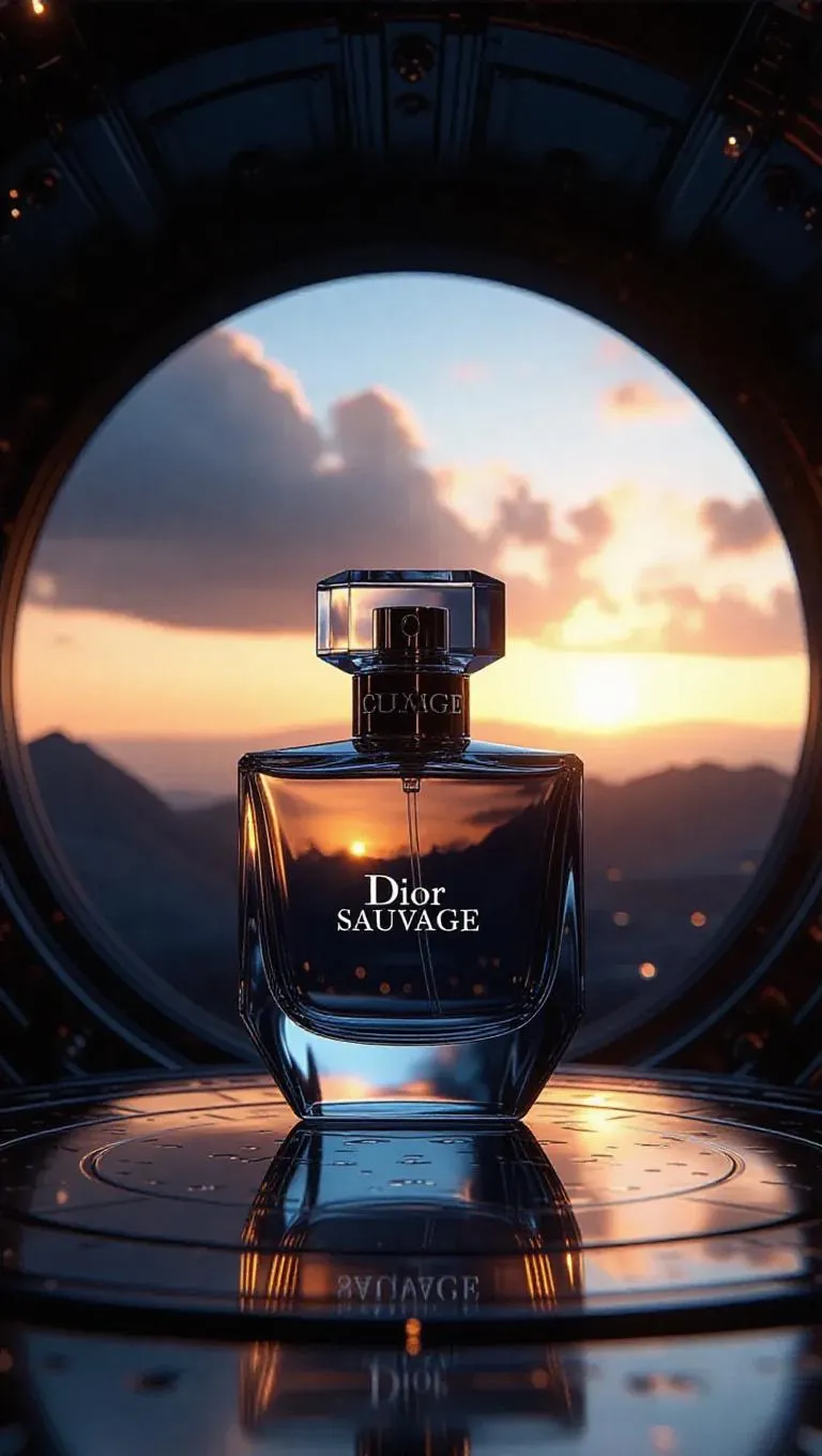 Transform your vision into reality with AI-generated luxury fragrance visuals. Explore a sleek Dior Sauvage perfume bottle design, blending elegant black-blue typography with futuristic metallic backdrops. AI-powered tools craft reflective surfaces, ambient lighting, and intricate scenic contrasts—mountains, sunsets, and industrial space pod aesthetics. Elevate branding with professional-grade AI image generation for premium product visuals.