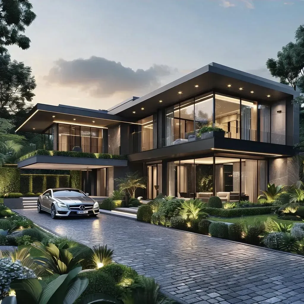 Generate a stunning AI image of a luxurious modern house with expansive glass windows, surrounded by lush landscaped gardens and vibrant greenery. A sleek luxury car accents the driveway, enhancing the elegant scene—crafted with professional-grade AI effects for realistic visual storytelling.