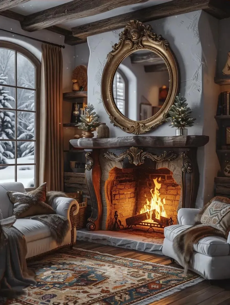Create a whimsical AI-generated living room scene with a cozy fireplace and a magical mirror. Perfect for interior design inspiration, this vivid image blends warmth and fantasy. Elevate your visuals using vivago.ai's AI tools for professional-grade, enchanting home decor imagery.